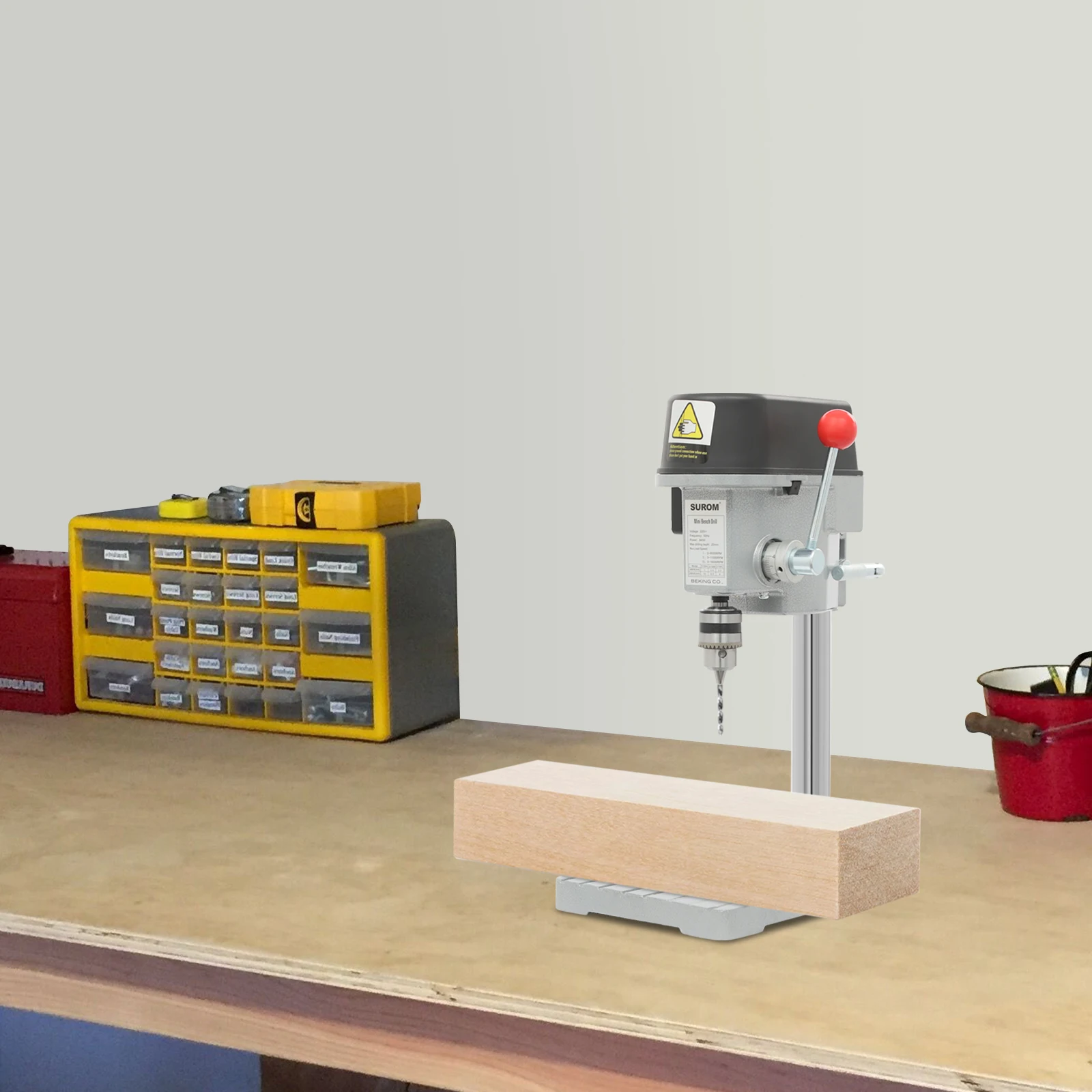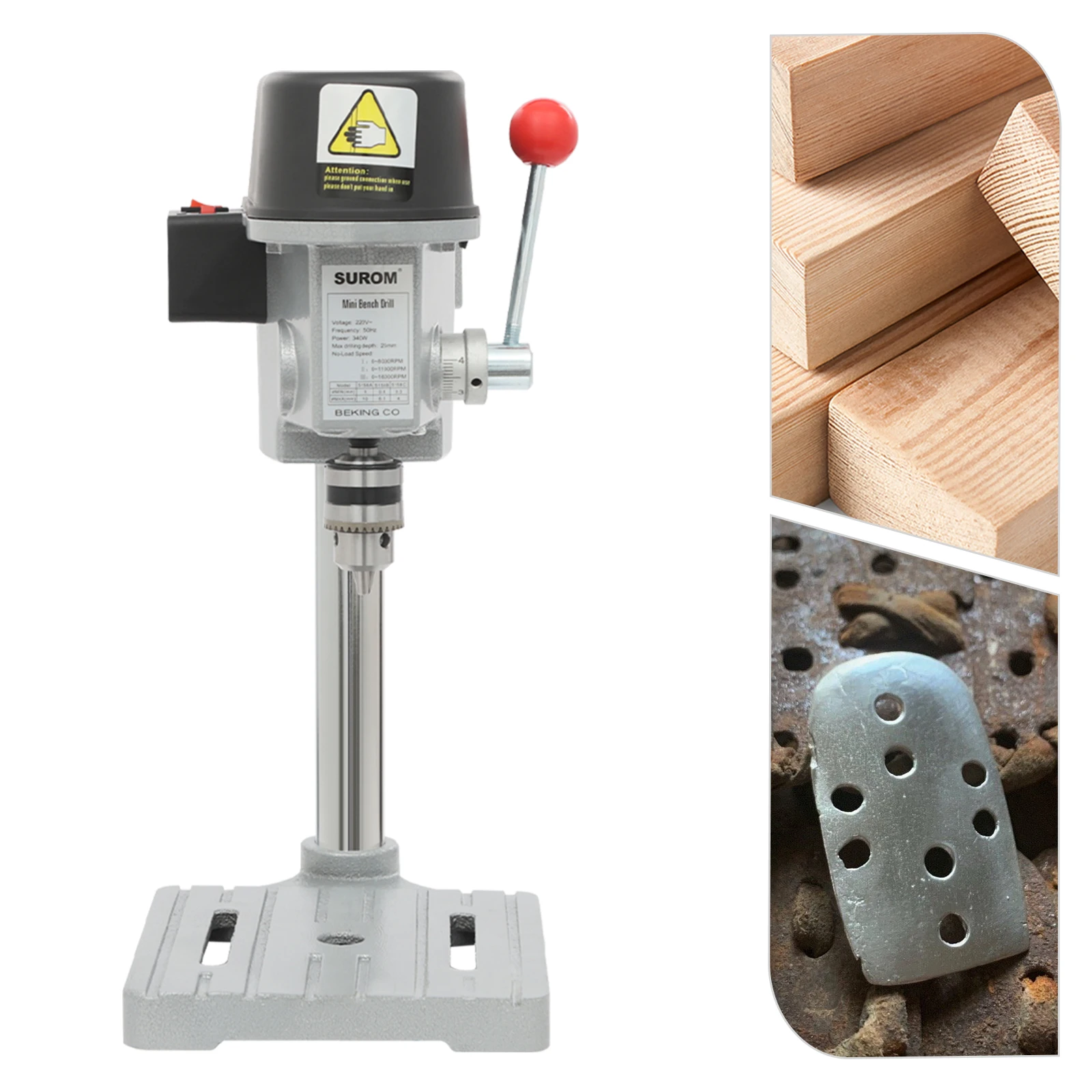 It can be used for drilling iron (diameter ≤0.24in), wood (diameter ≤0.63in), plastic board, aluminum board, composite board, resin board, thin metal, circuit board, and other non-rigid materials. It can also be used for teaching experiments, DIY crafts, or furniture, such as Buddhist beads, shells, crystals, toy models, and so on.