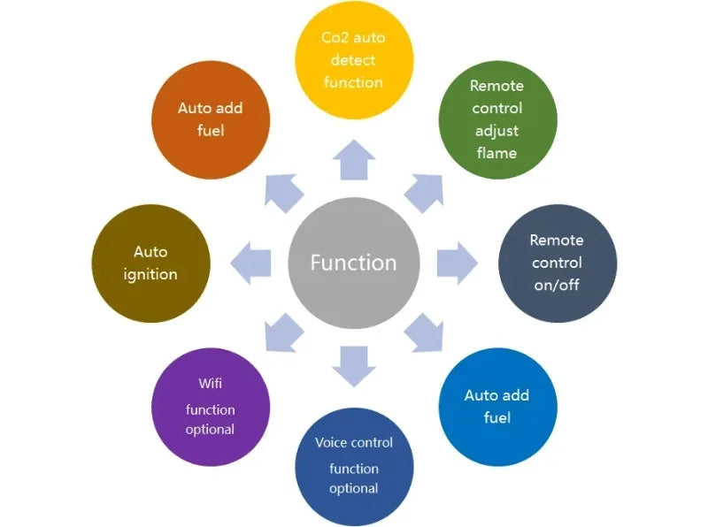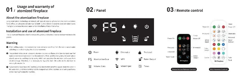 Water vapor fireplace has function of automatic water in and out. when the water is full, it will automatically stop the water fill-in and start to work, when the water is not enough , it will automatically stop working. The working time can be set by remote or Mobile APP directly.
