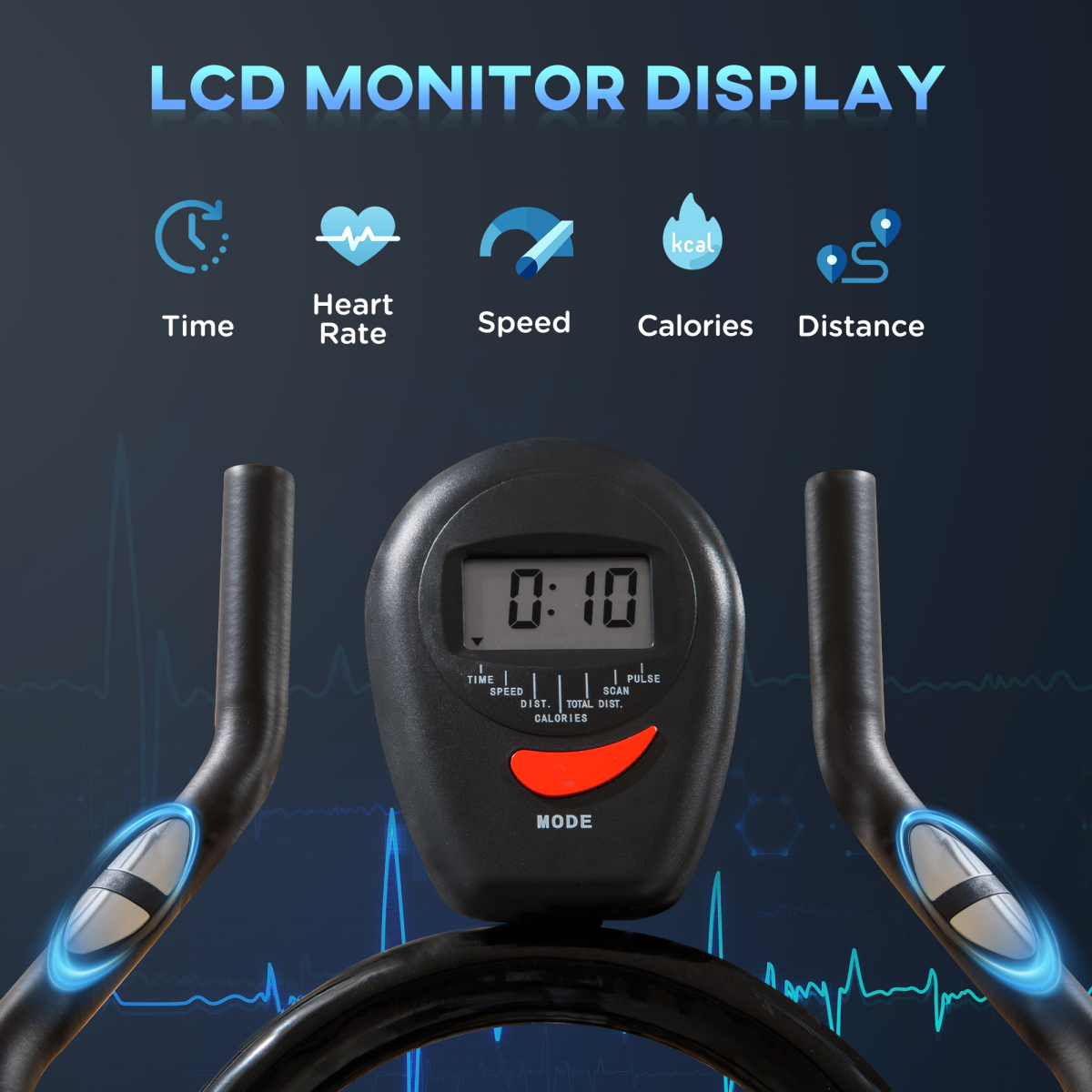 Customize your workout with adjustable seat and handlebars, ensuring perfect alignment and comfort for users of all heights. Effortlessly change the intensity of your workout with the adjustable resistance feature, allowing you to push your limits as you improve. The built-in LCD display tracks your time, distance, and calories burned, keeping you motivated and informed throughout your exercise routine. With the added convenience of two wheels, this stationary bike can be easily moved and stored when not in use.