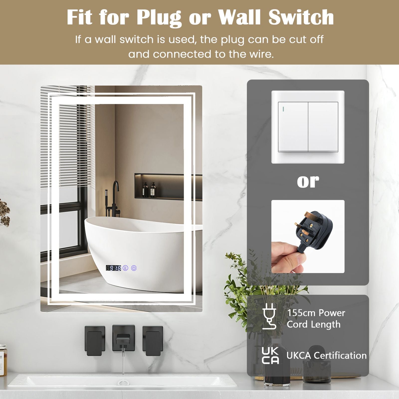Fit for Plug or Wall Switch: The bathroom led vanity mirror is designed to be flexible and convenient. Whether you prefer using a plug or a wall switch, the mirror can be easily accommodated. Simply cut off the plug if you're connecting it to a wall switch. Plus, the 155cm power cord length is for easy installation.