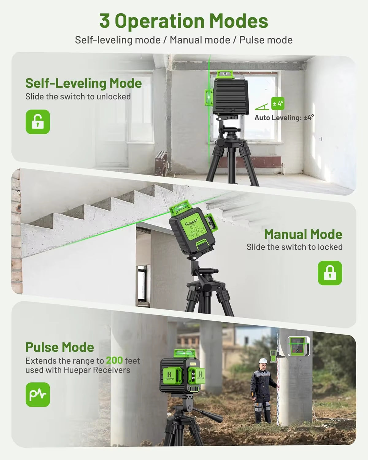 Note: When use with a receiver, it’s necessary to turn on the pulse mode. It is compatible with Huepar Line Laser Receiver only.