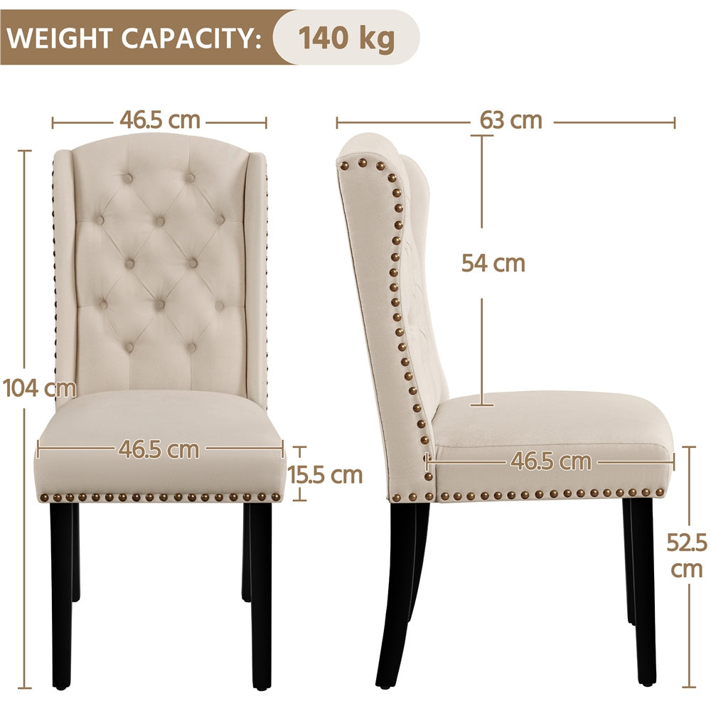 This set of two classic dining chairs is upholstered and features a spacious and supportive seat, offering a comfortable seating space. Metallic studs adorn the seat and backrest, a luxury detail that adds a classical look to this accent dining chair set.