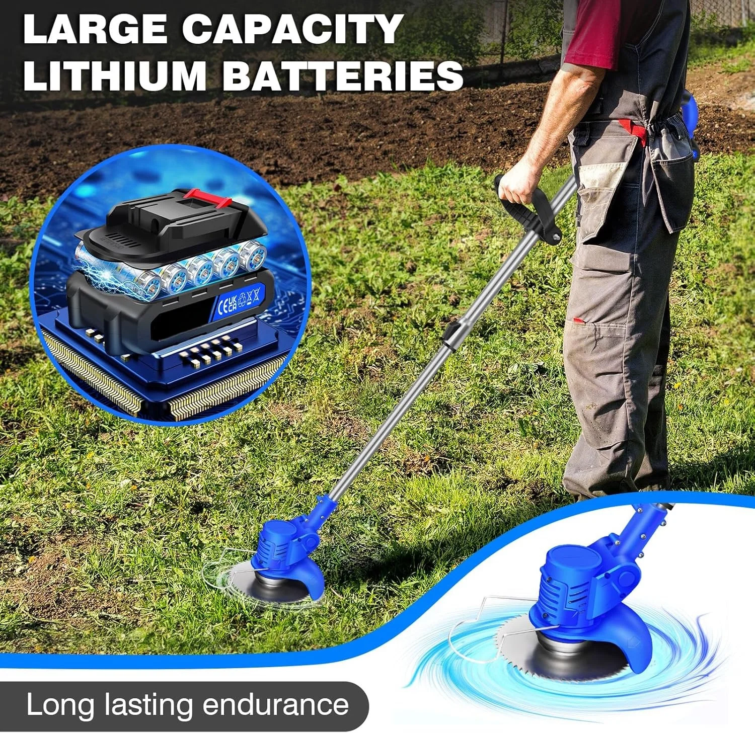 Cordless Electric Lawn Mower and Grass Trimmer - 21V Adjustable Length Cutter with 36000RPM Battery Included