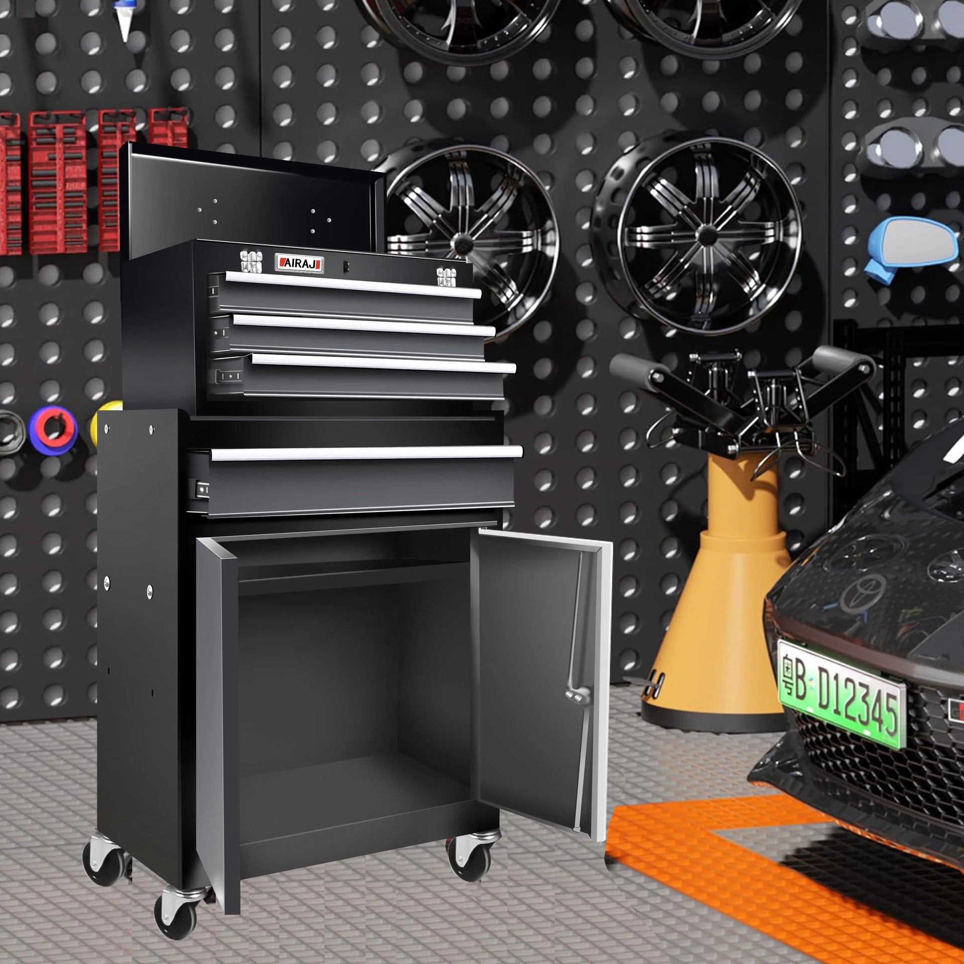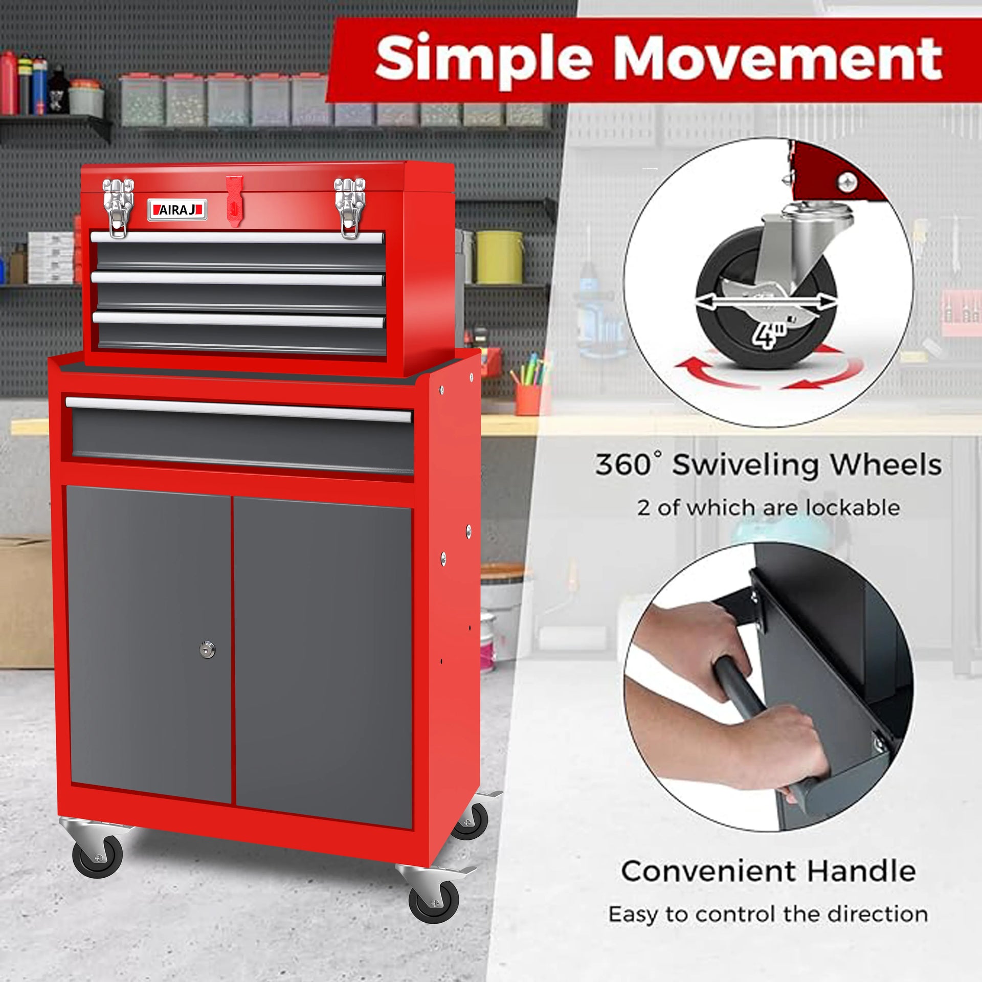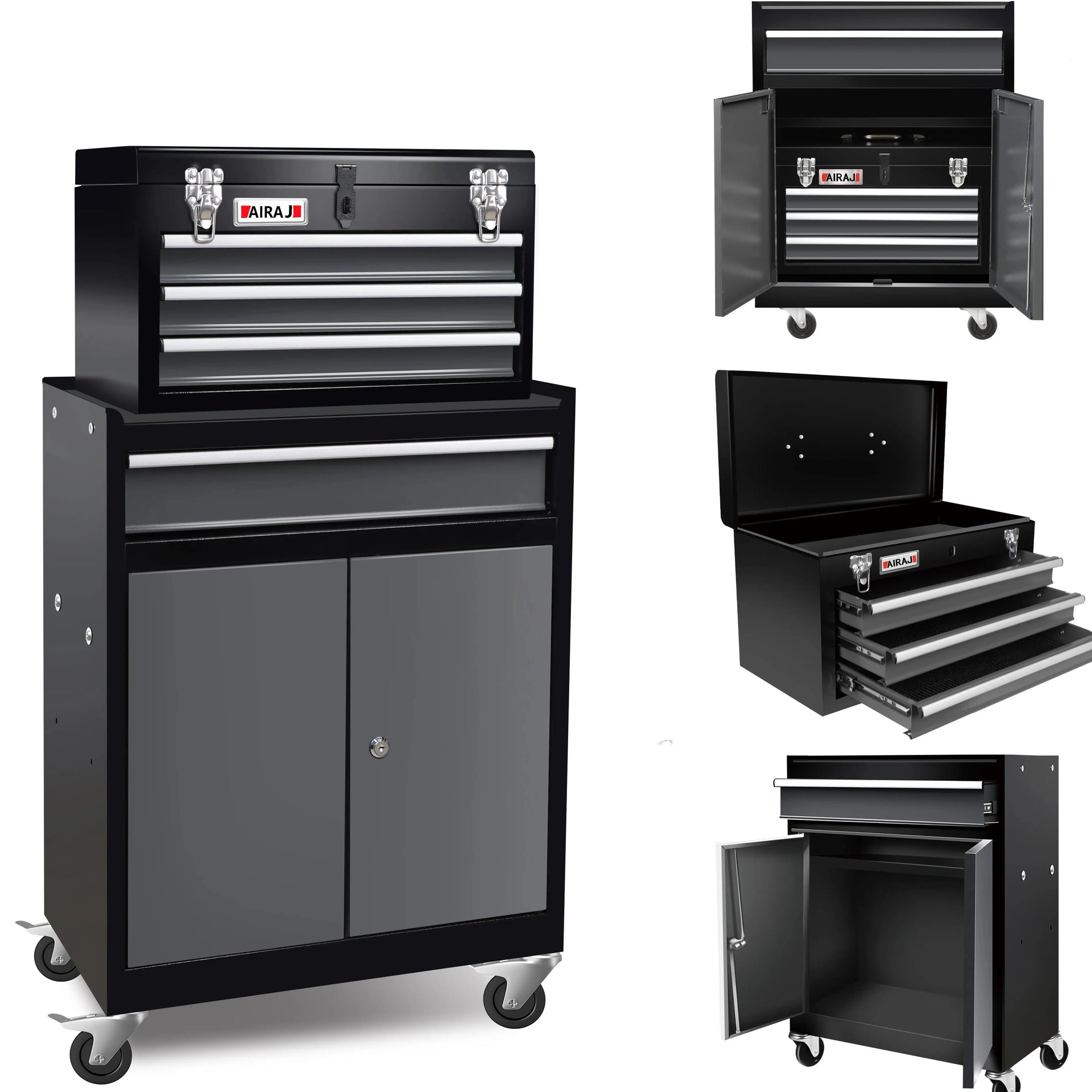 【2-in-1 Design】The tool cabinet has a large capacity and a unique 2-in-1 design that saves space and provides large storage capacity. The tool chest can be divided into a portable small tool box and a rolling tool chest. The tool box has a handle on the top, making it easy to carry when working outside. The tool chest with wheels has a drawer and a large storage space with double doors, making it more convenient to store large items
