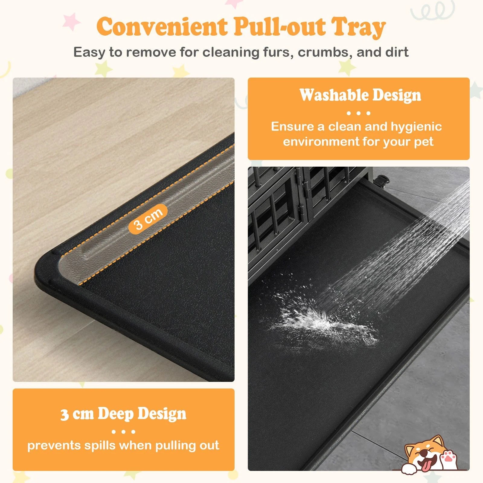 Foldable Design and Easy Assembly: With its flexible folding hinges, this portable dog cage can effortlessly fold into a compact size in seconds, allowing for space-saving storage in narrow areas when not in use. Additionally, the installation is a breeze, requiring only the attachment of wheels and tray.