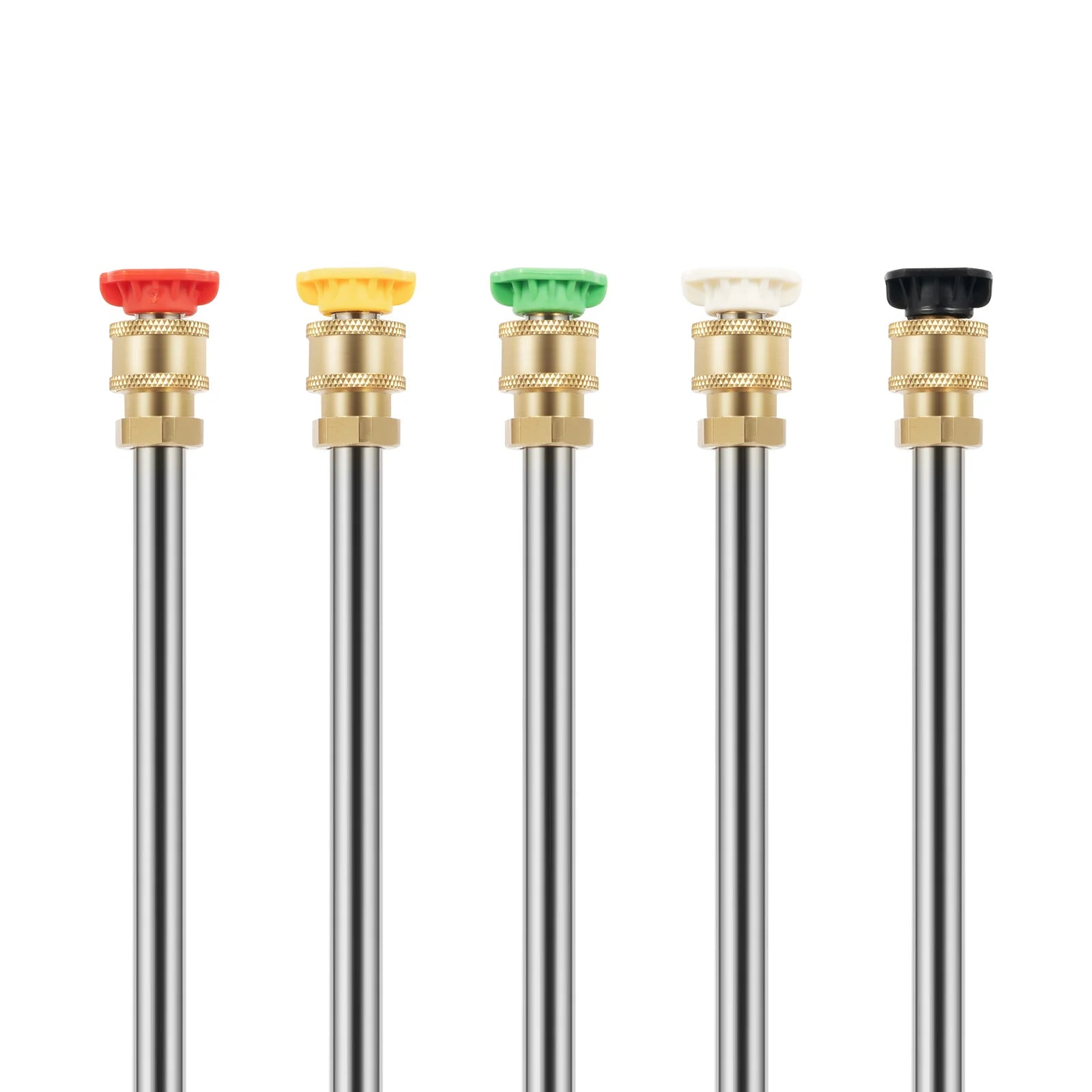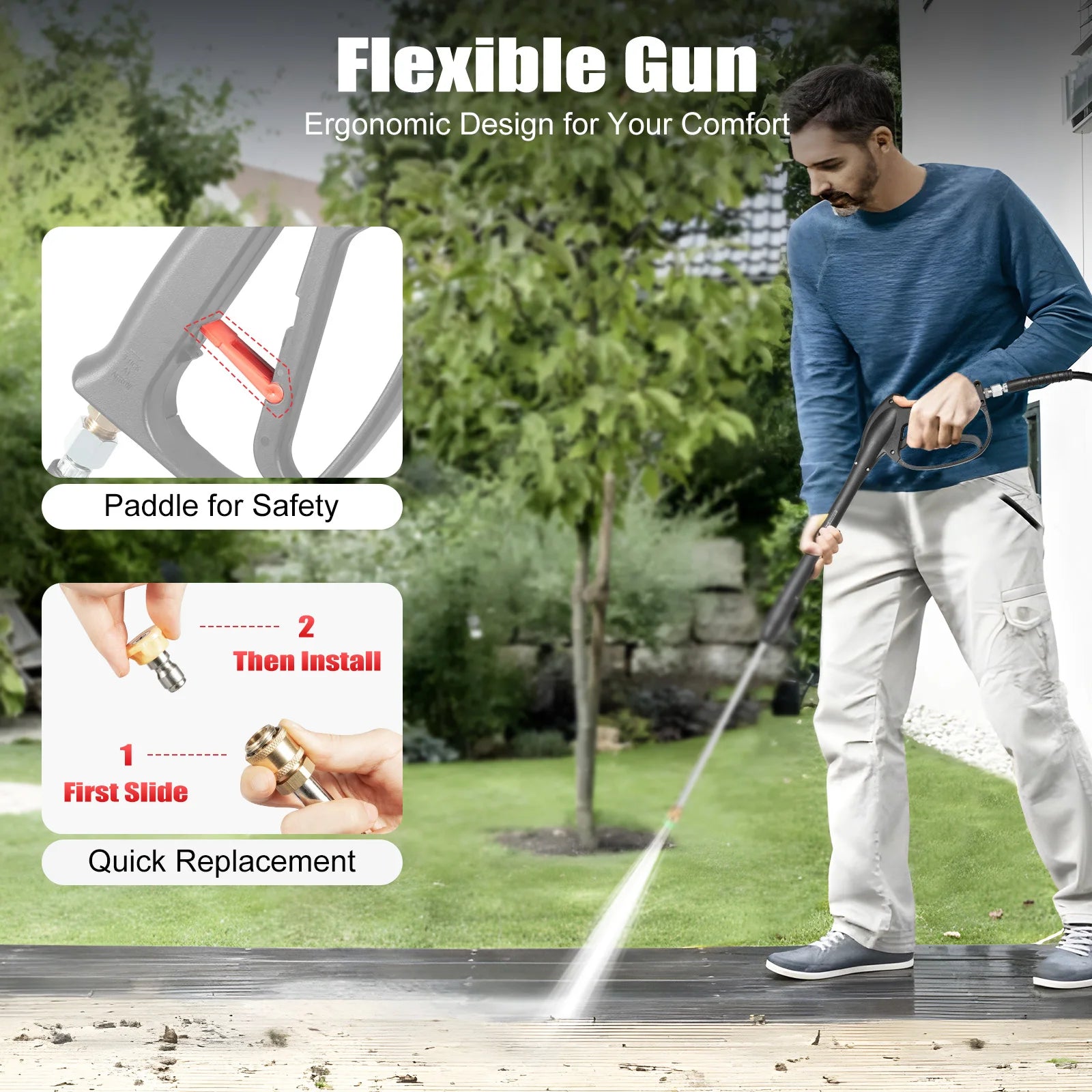 Superior Spray Gun: Its copper core ensures long-lasting reliability under high pressure, while the ergonomic handle keeps cleaning comfortable. A quick-connect system simplifies attaching the extension rod, and nozzle changes are a breeze, just slide the end buckle back, and swap between the five nozzles in seconds. It turns tedious setup into quick prep, letting you focus on cleaning efficiently.