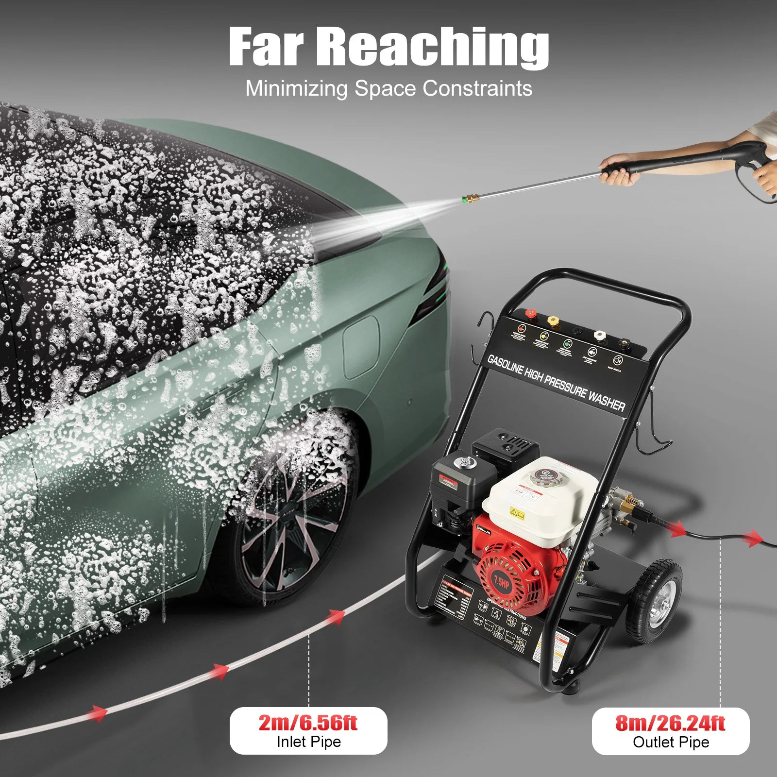 Enhanced Efficiency: The 7.5HP engine, axial cam pump, and reliable carburetor deliver 3400rpm, 2200 PSI (170-190 Bar) pressure, and 2.3 GPM flow. The swashplate plunger pump adds stronger pressure for stable, thorough cleaning. It quickly removes dirt, solves daily cleaning needs, and maximizes device lifespan.