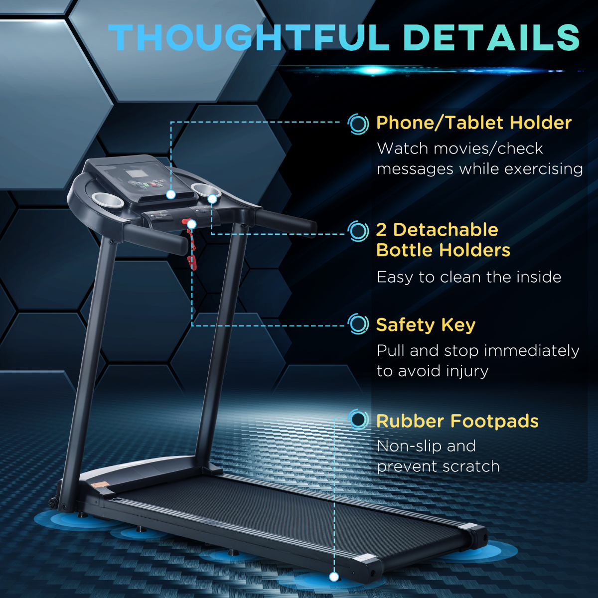 For added safety, the treadmill is equipped with a safety key that immediately halts operation when disengaged, ensuring peace of mind during your workouts. Plus, the convenient two wheels on the treadmill's base make it easy to move and store when not in use.