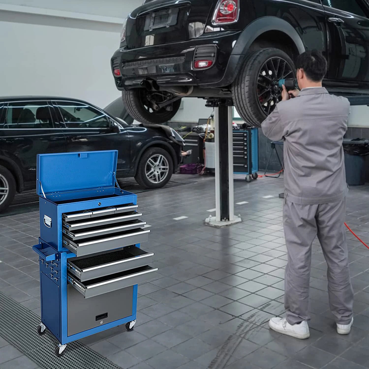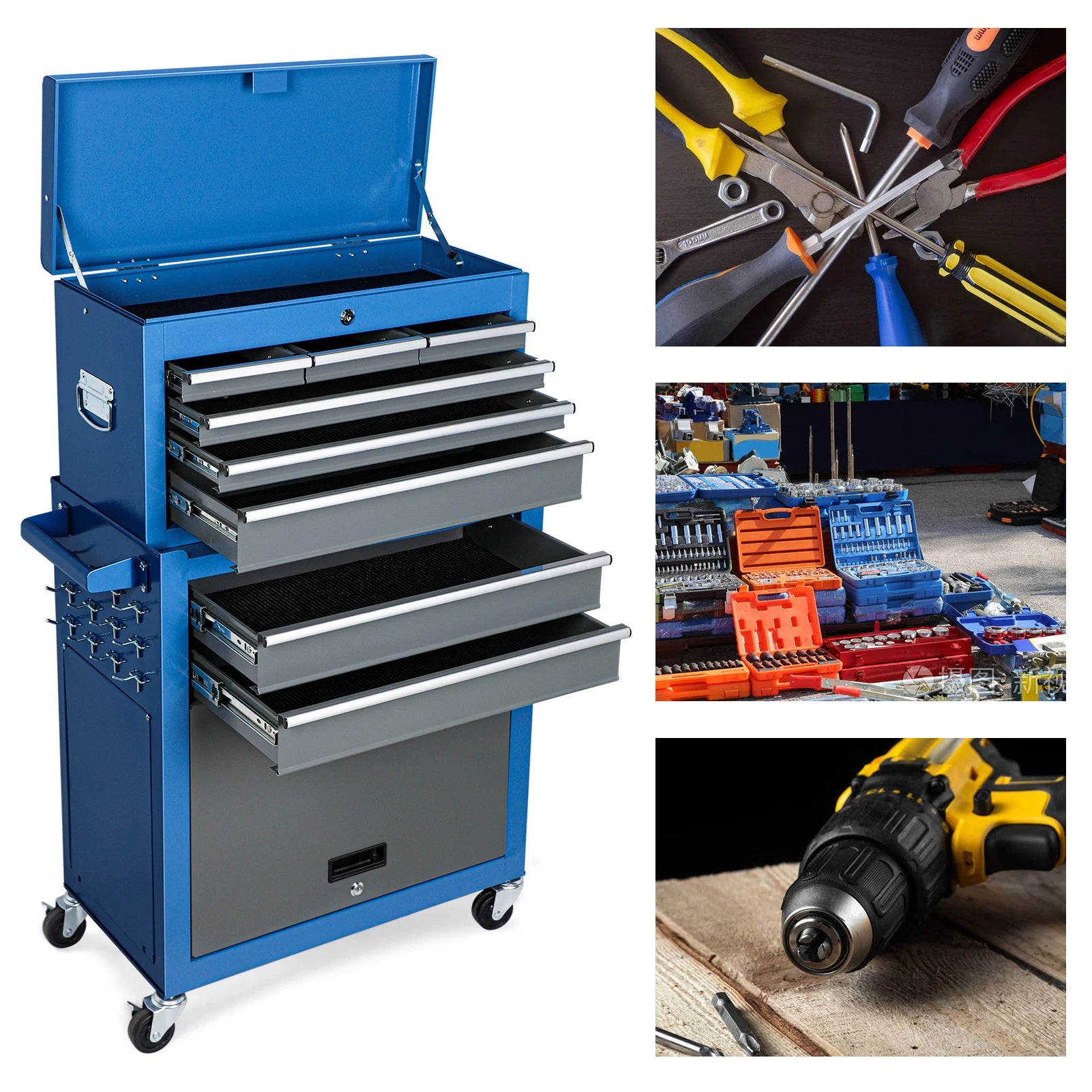 The Large Tool Cabinet with 7 Boxes offers a robust storage solution measuring 62×33×109 cm and supporting up to 250kg. Crafted from high-quality metal steel with a powder-coated finish, it ensures durability, rust resistance, and a stable structure ideal for garages and warehouses. This versatile cabinet features a top box, three small drawers, three large drawers, two tray drawers, and a spacious cabinet, allowing organized storage of tools by size and type. Both the top box and large cabinet include locks for secure storage of valuable items. Equipped with four 360-degree safety wheels—two lockable rubber brakes and two PP universal wheels—it provides smooth mobility and stability. Clear installation instructions and included materials make assembly straightforward and efficient.