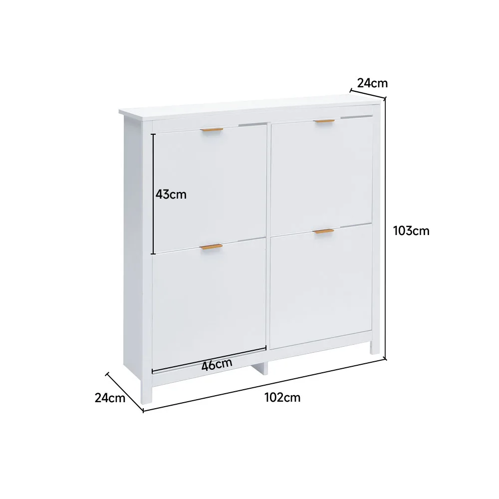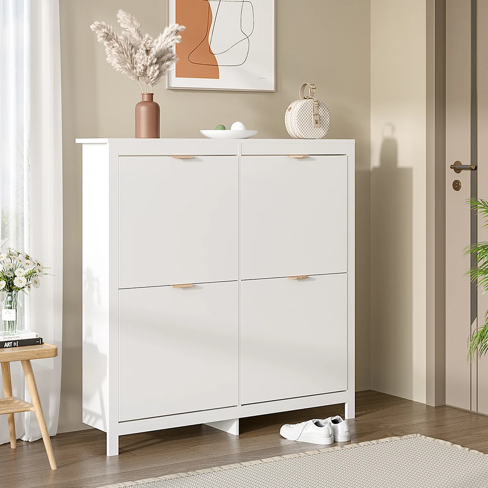 Stash your shoes stylishly in the Livingandhome shoe cabinet. This modern shoe storage solution is designed with a low profile and a svelte size so as to fit neatly against a wall in a hallway, mudroom or entryway. Four compartments each fit four pairs of shoes, this shoe cabinet comfortably holds a total of approximately sixteen pairs of footwear, which varies depending upon the size of your shoes. Better still, the flip-down drawers provide quick and easy access to your shoes when rushing out the door.