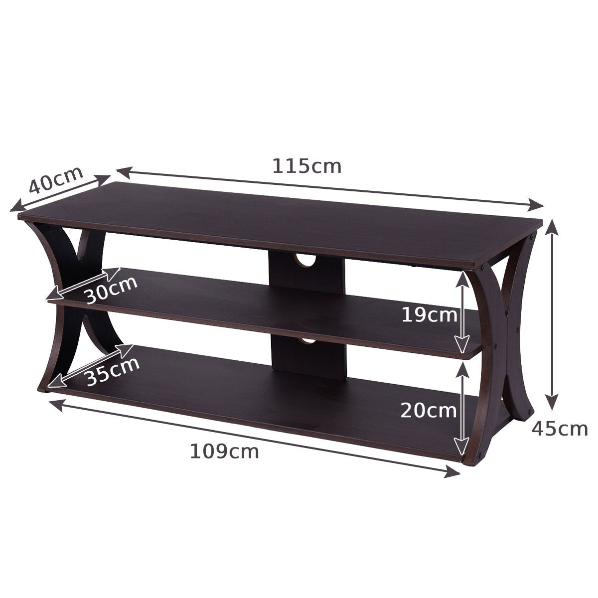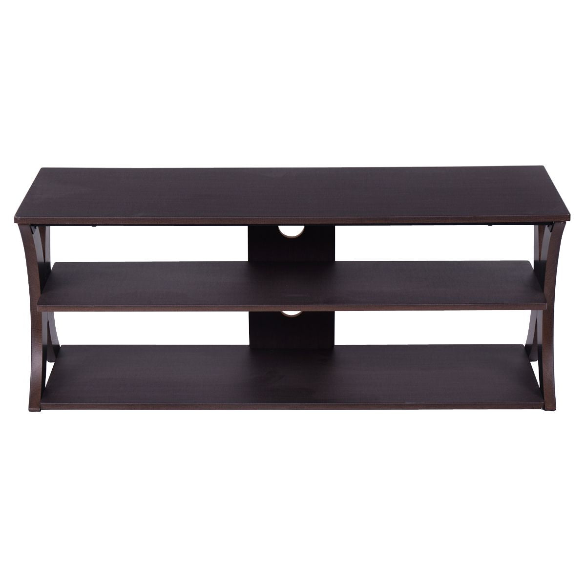 This entertainment stand accommodates flat-screen TVs up to 45”. All open shelves are easy to store your DVDs, X-box, speakers, and game devices. With cord management port at the back of each shelving space, you’ll never have to worry about a tangled mess of wires as it’ll keep them organized. You can watch movies and play games as you like. This modern television stand is crafted from wood frame with a durable finish for long term use. The simple and retro style adds elegant charm to your room, perfectly matched with different styles of furniture.