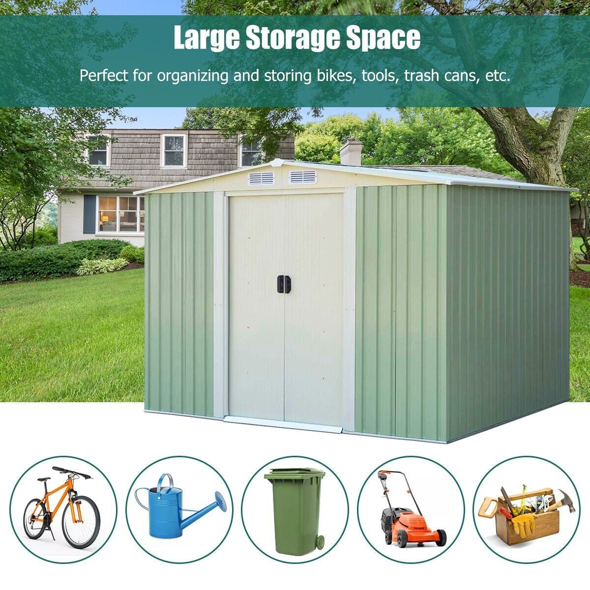 Still worried about a messy garden? This metal storage shed is dedicated to keeping your garden neat and organized. It offers roomy storage space for your lawn mower, sports equipment, bikes or other accessories. The sloping roof will not leak water even on rainy days. Wide sliding doors with handles allow easy access to any tools. What's more, 4 built-in windows keep it ventilated at all times. Made of weather-resistant galvanized metal, it will stand up to season after season of use. This outdoor storage shed is perfect for garden, lawn, backyard and so on.