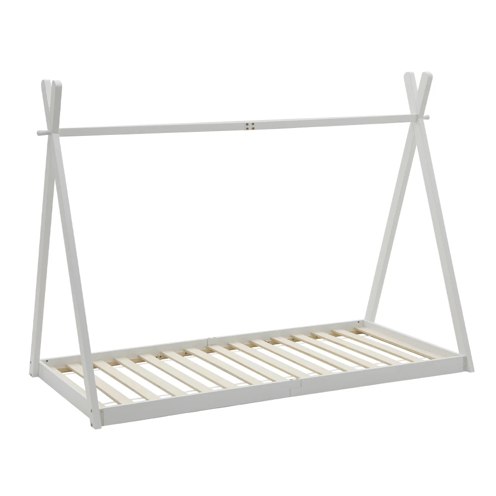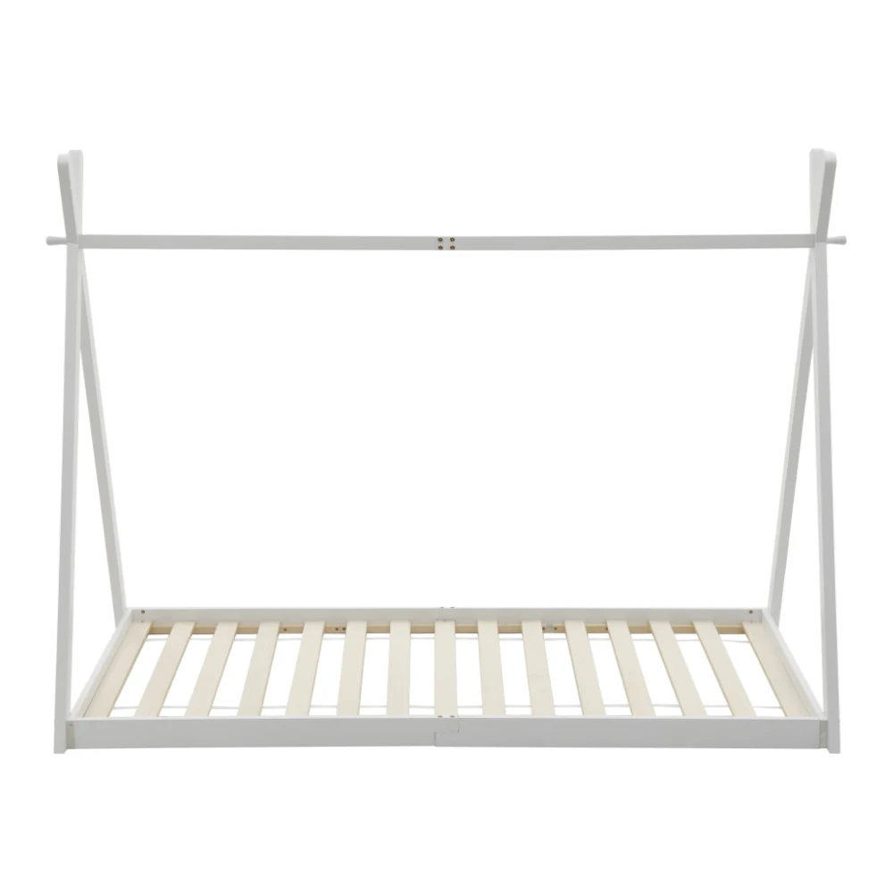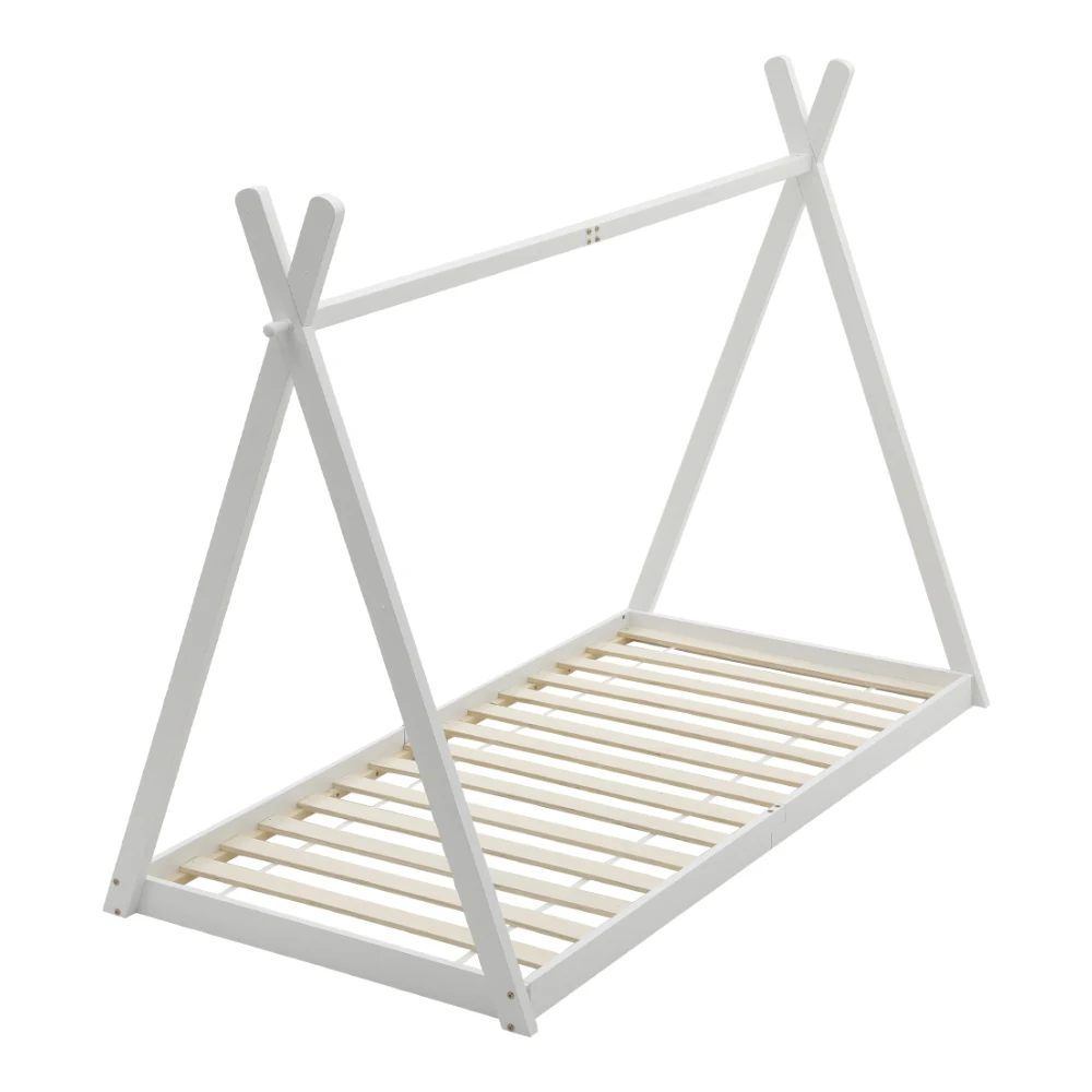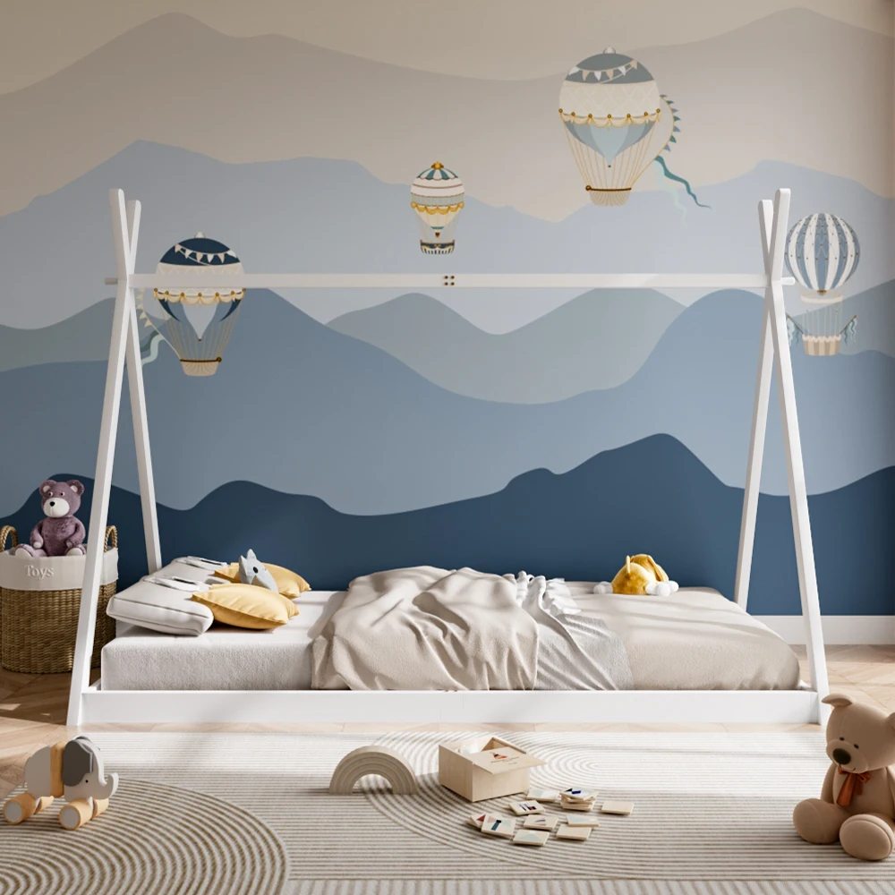 Ease your child's transition from an infant to a toddler bed with this Montessori Kid Bed. Constructed from solid pine wood and treated with safe, non-toxic paint, the bed offers a clean and attractive appearance while ensuring safety. With a low base, children will not have trouble climbing in and out. You can add a tent-shaped canvas cover to add an element of fun, turning the bed into an indoor camping space that provides comfort without the need for a distant trip. Create a carefree and enjoyable space for your child with this charming bed.