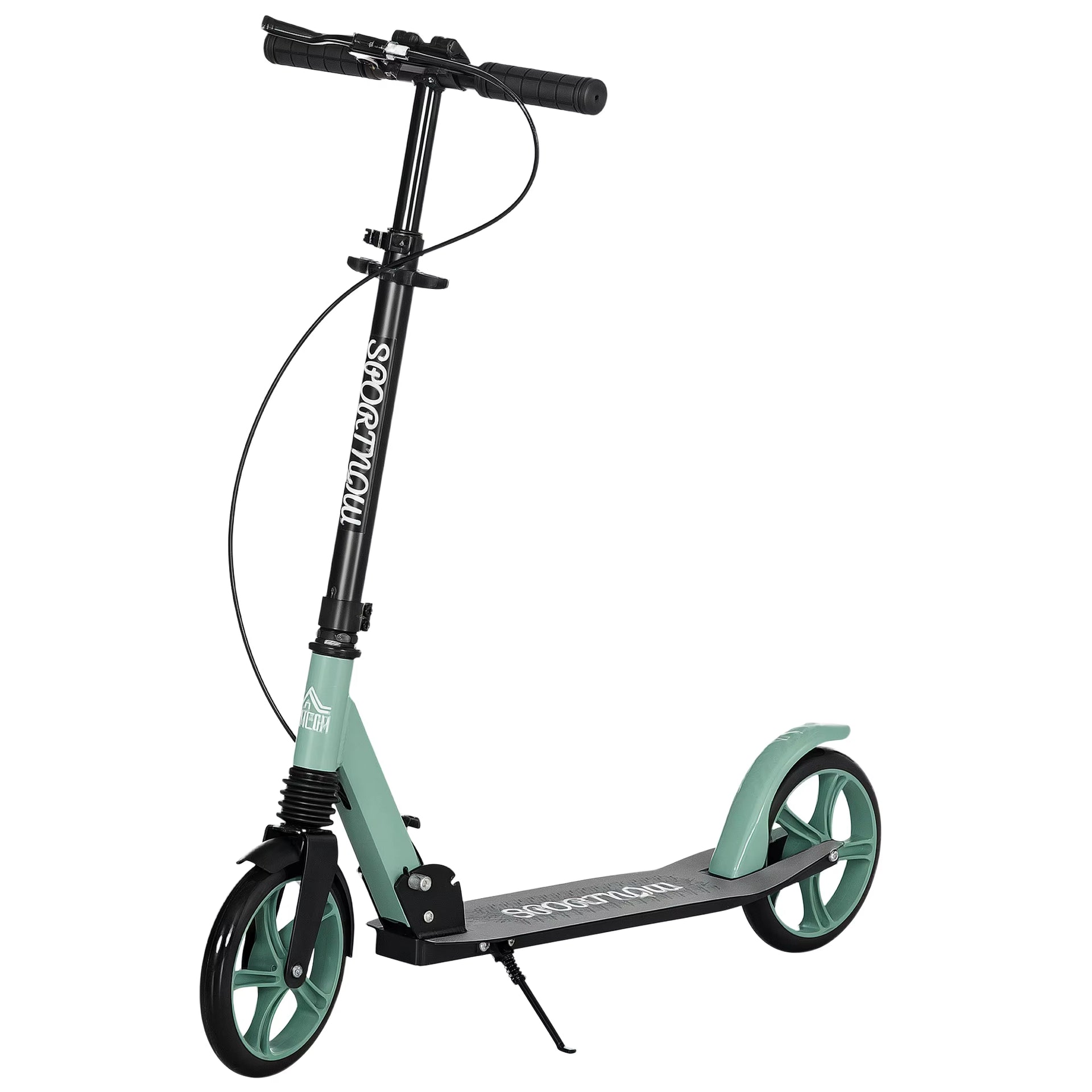 Scoot around wherever your destination takes you: take it with this kick scooter from HOMCOM. The frame is made from aluminum - rugged yet lightweight, and will fully support you when in use, with the two wheels and non-slip foot deck ensuring a safe ride every time. The adjustable handlebar makes it suitable for different heights, with grip-covered handles to comfortably hold on. The front shock absorber for smoothness on the road; comes complete with a pull-down stand.