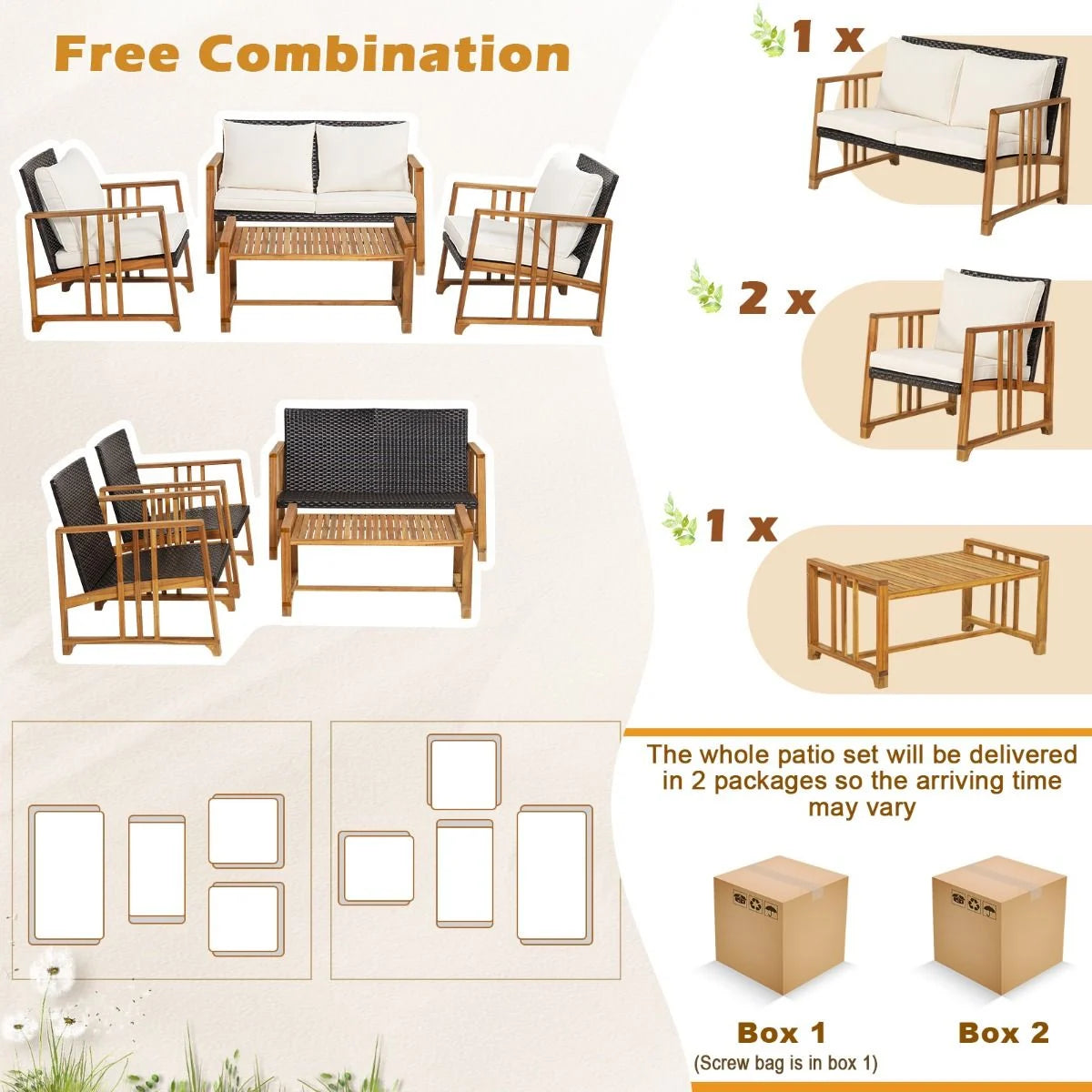 This 4-piece outdoor wicker set will make you more relaxed in outdoor places. Constructed of premium acacia wood, the chair frame and coffee table are elegant, solid and easy to maintain. The heavy-duty metal structure of chairs ensures higher stability. And the seat and back are made of premium PE rattan which is suitable for outdoor use. What's more, both the single chairs and loveseat are comfortable to sit with ergonomic design. The soft seat and back cushions offer more coziness to you. You can arrange the 4 pieces to different positions as you need. And the whole patio set will be an ideal addition to your backyard, front porch and so on.