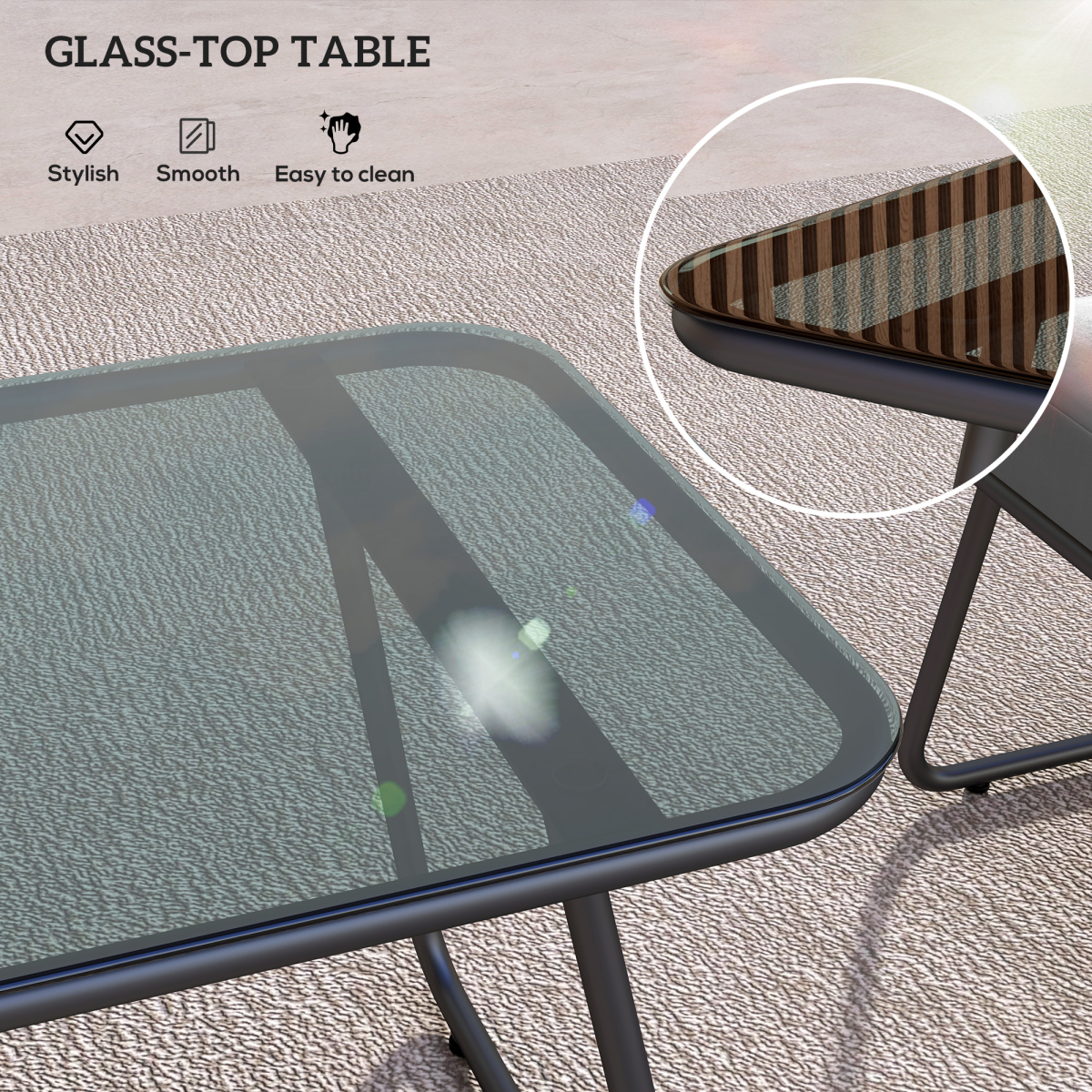 Relax in style with this four‑piece garden furniture set. It includes a generous loveseat, two single sofas, and a glass-topped coffee table, all wrapped in UV‑resistant PE rattan over sturdy powder‑coated steel frames. Thick seat and back cushions with removable covers offer lasting comfort, while the glass tabletop provides an easy‑to‑clean surface for outdoor entertaining. Protective foot pads and adjustable feet help keep the set stable on uneven ground. Assembly is required. Color options include Grey and Dark Grey. Materials: Steel, PE Rattan, Polyester, Glass.