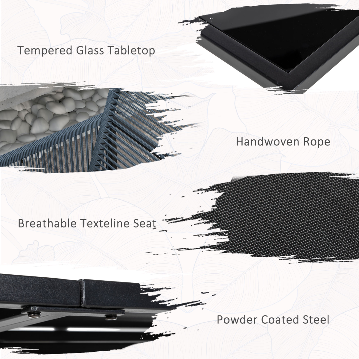 Elevate your outdoor space with this five-piece patio dining set designed for poolside lounging and al fresco meals. It includes four comfortable chairs and a matching table. The foldable backrests save space when not in use, while the 5mm tempered glass tabletop is durable and easy to clean. A powder-coated steel frame provides rugged outdoor performance, complemented by breathable texteline seats that dry quickly and handwoven rope accents that add warmth and natural beauty to any patio or garden.