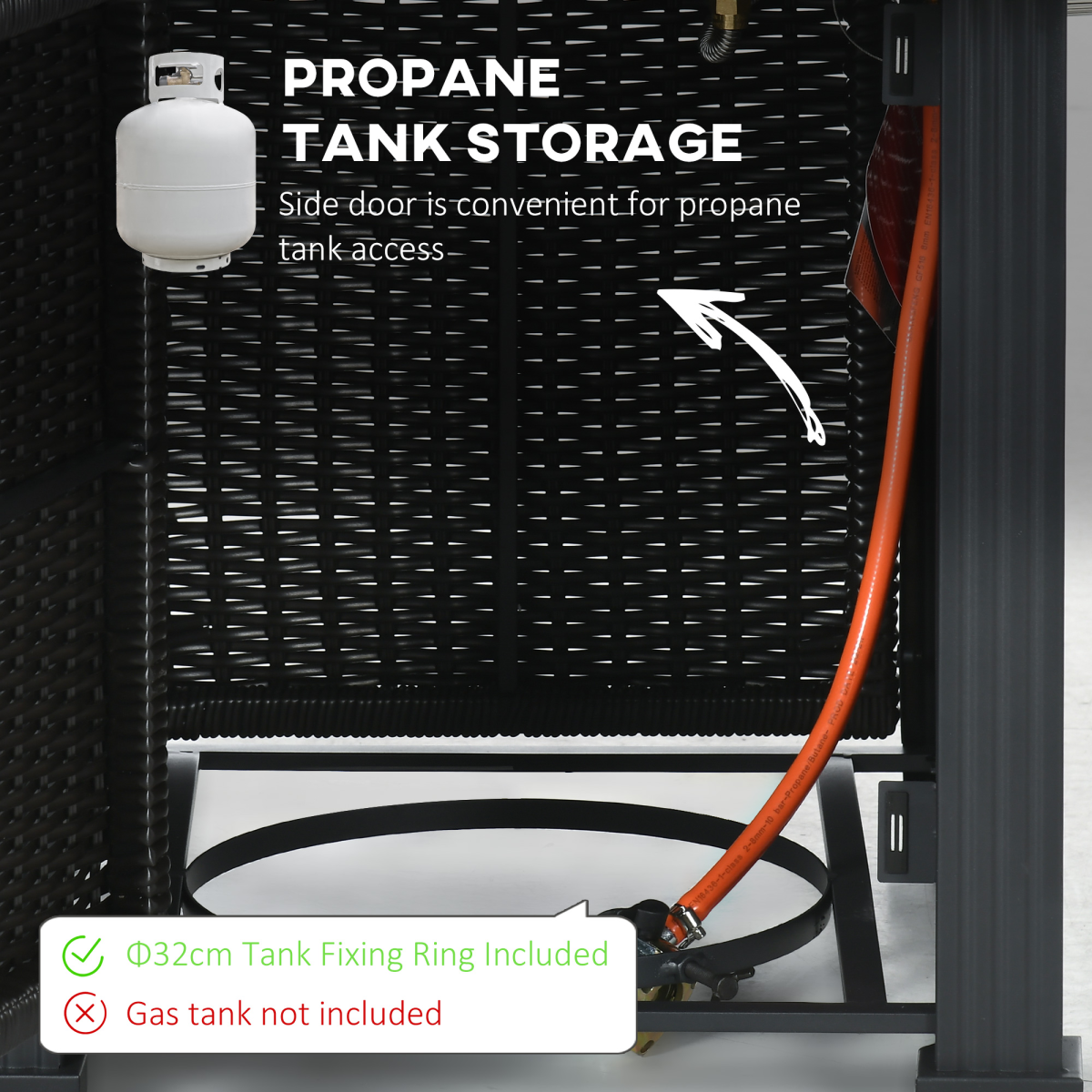Power comes from a 50,000 BTU burner that delivers a clean, smokeless flame for ample warmth and ambiance. An electronic ignition starts quickly, with a flame adjustment knob to dial in the perfect heat. For safety, a built-in thermo thermometer monitors flame and temperature and will automatically shut the valve if the flame goes out. A glass wind guard contains sparks while adding a sleek aesthetic. The rattan-wrapped body offers weather-resistant style that blends with garden furniture, and decorative glass stones add a warm glow when lit. Includes regulator and hose for propane setup (tank not included).