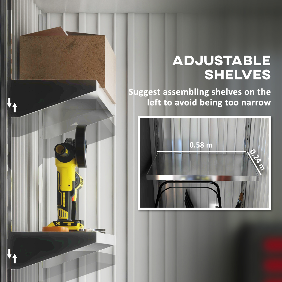 Compact and practical steel shed designed for small outdoor spaces. This lean-to unit keeps garden tools, pool supplies, lawn care gear, and even bikes or long-handled equipment neatly organized. A 2-tier adjustable shelf provides flexible storage, making the most of every inch.