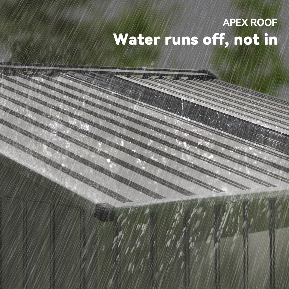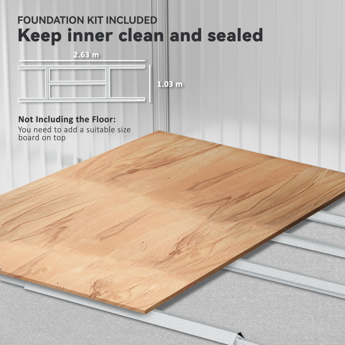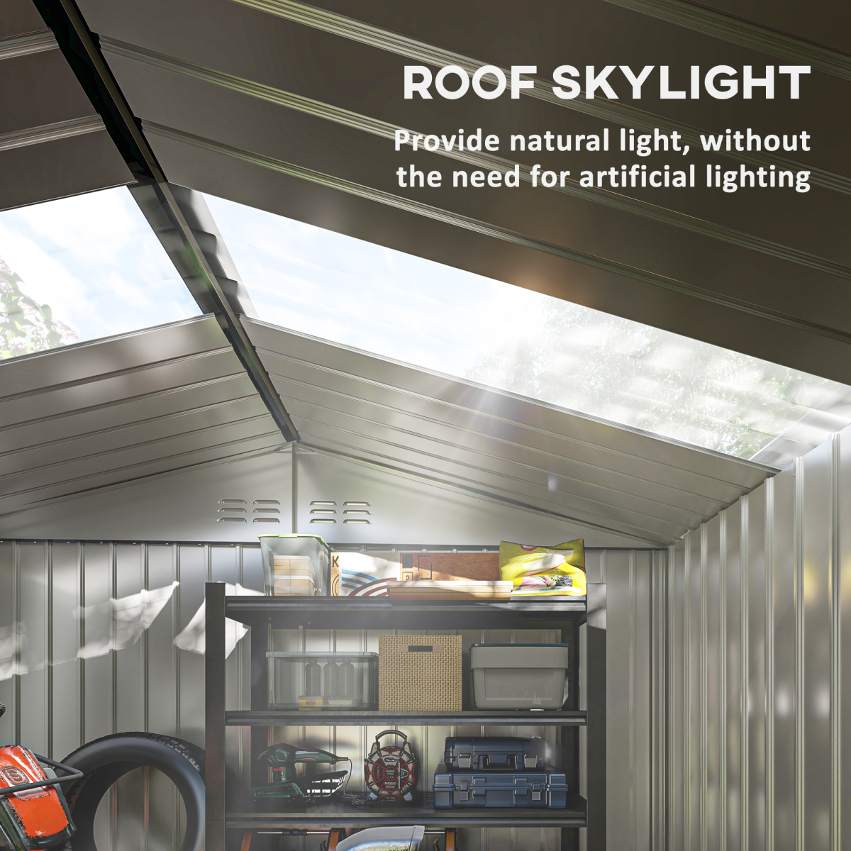 The sloped roof provides efficient water drainage to prevent surface damage and rust, while four ventilation holes help keep the interior fresh and well‑aerated. A sliding, lockable double door offers easy access and added security. A foundation kit is included to ensure a level, stable base. Assembly is required.