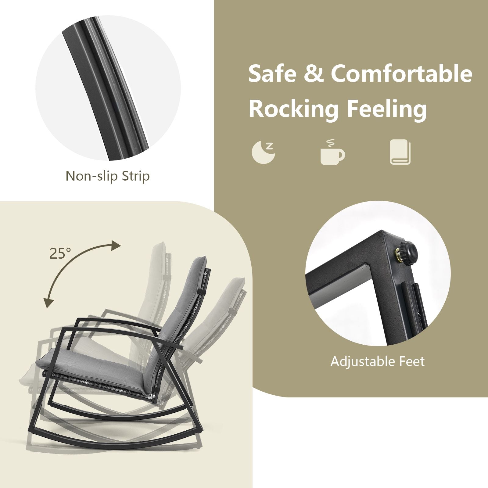 Safe and Comfortable Rocking Feeling: Equipped with non-slip strip and adjustable feet, these patio chairs will provide you with unique rocking experience while ensuring your safety. Besides, the high backrest and ergonomic armrests can relieve your fatigue for better support.