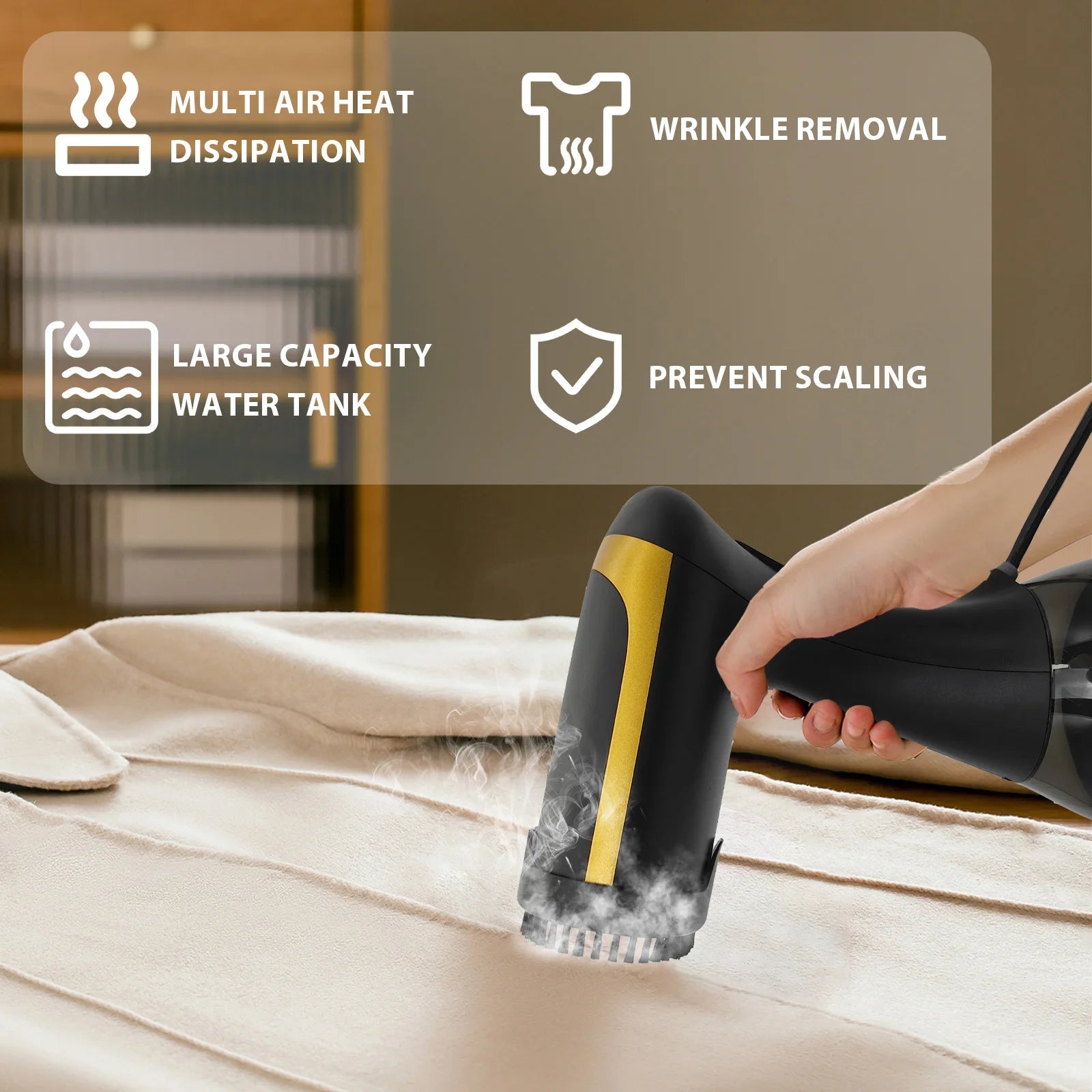 Safety: Built-in multiple safety protection mechanisms, when the water tank is out of water, the body will automatically cut off when overheating, to prevent dry burning caused by the danger, the use of accidental bumping, will also quickly stop working, all-round guarding ironing safety.