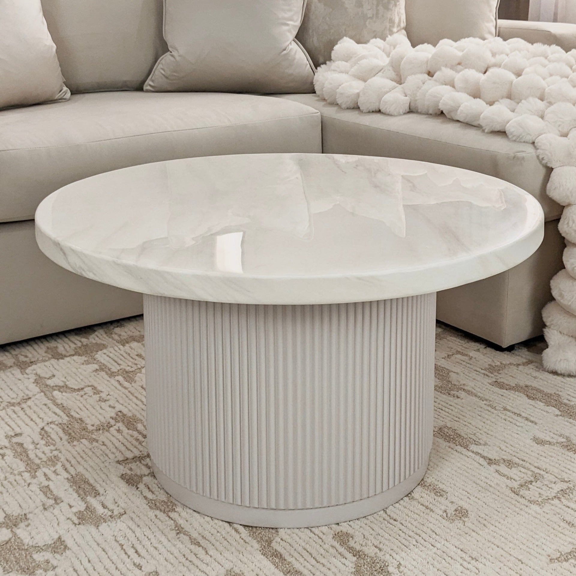 This stunning piece features a smooth, round faux marble top that exudes sophistication and timeless elegance.The base, crafted with a sleek, ribbed design, adds a touch of modernity to the classic marble look.