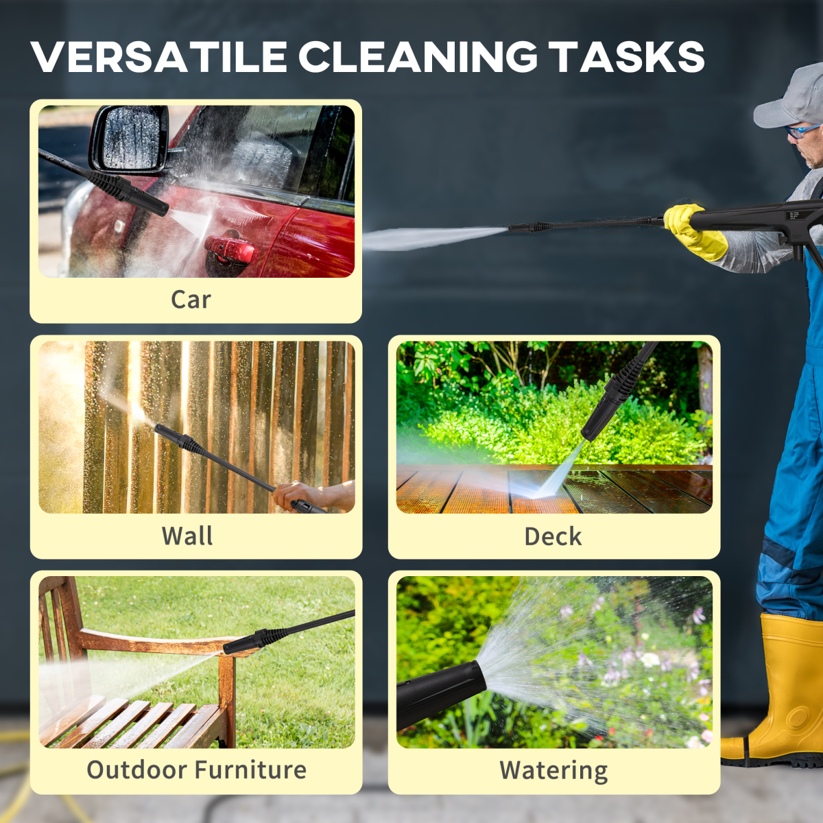 Revitalize your outdoor space with the DURHAND Portable Power Washer! Perfect for cleaning your garden, car, or furniture, this powerful pressure washer packs a punch with a robust 1800W motor. It generates a formidable 150 bar of pressure, delivering a remarkable flow rate of 510 liters per hour, making it your go-to solution for stubborn stains and grime. Designed for convenience, it features a six-meter long hose and a five-meter power cord, allowing for unparalleled flexibility while you clean. The wheeled design makes maneuverability a breeze, ensuring you can easily tackle any cleaning challenge in your yard or driveway!