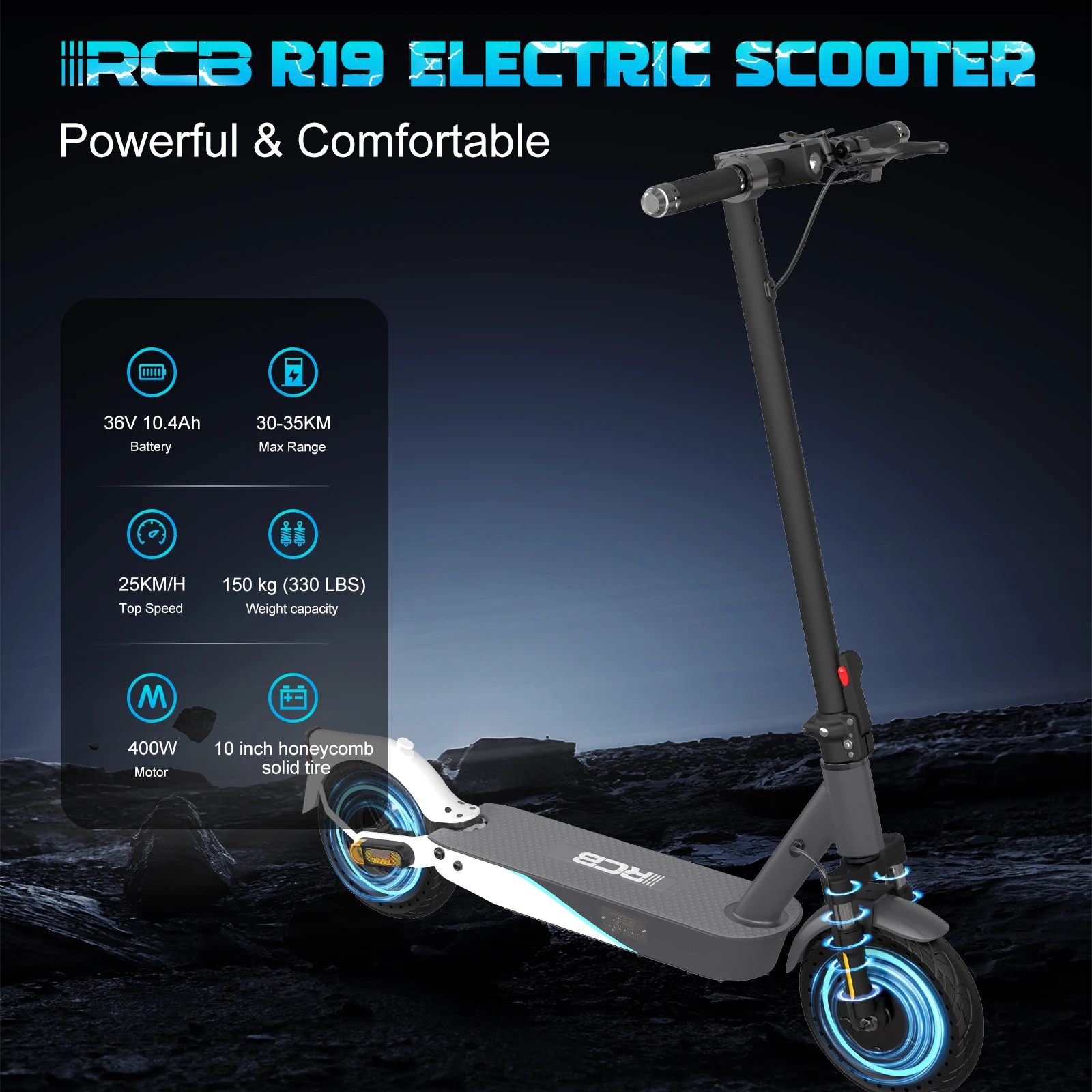 【Powerful and Intelligent】The RCB R19 electric scooter has a 400W power motor allowing it to reach 25 km/h and face slopes of 15%. Up to 35 kilometres of battery life with high performance battery under certain conditions. Maximum load is 150KG.