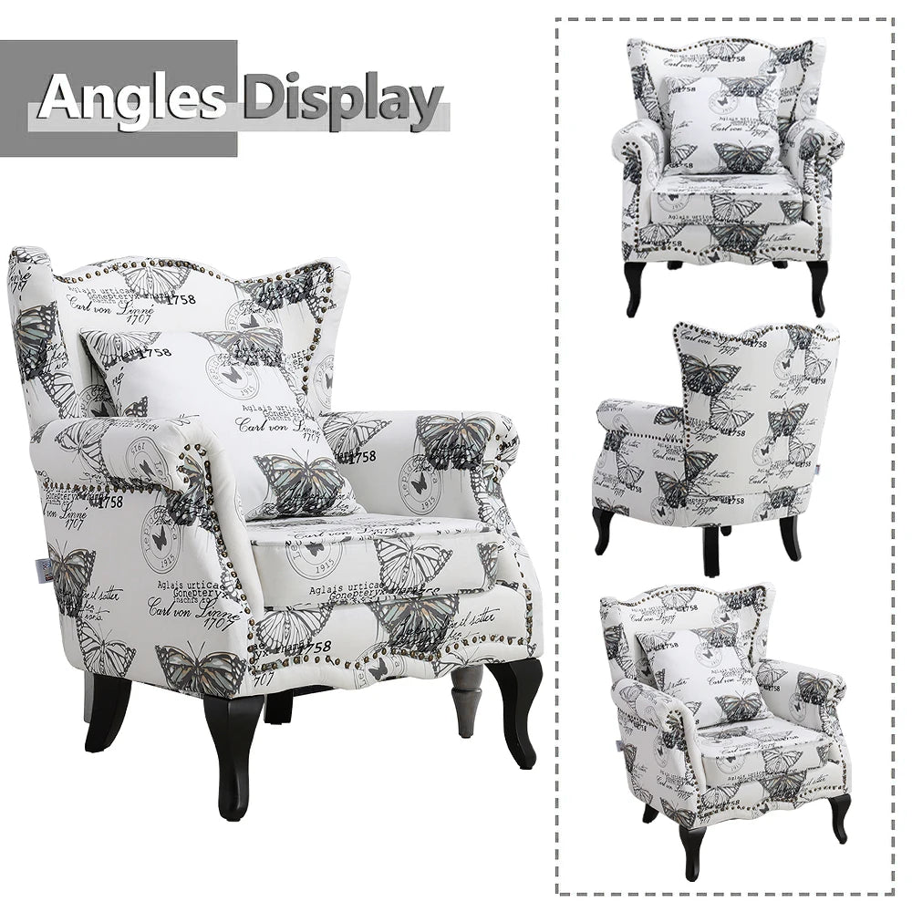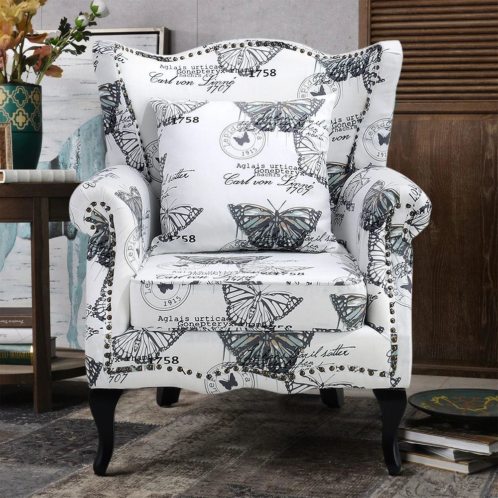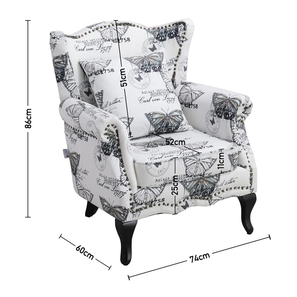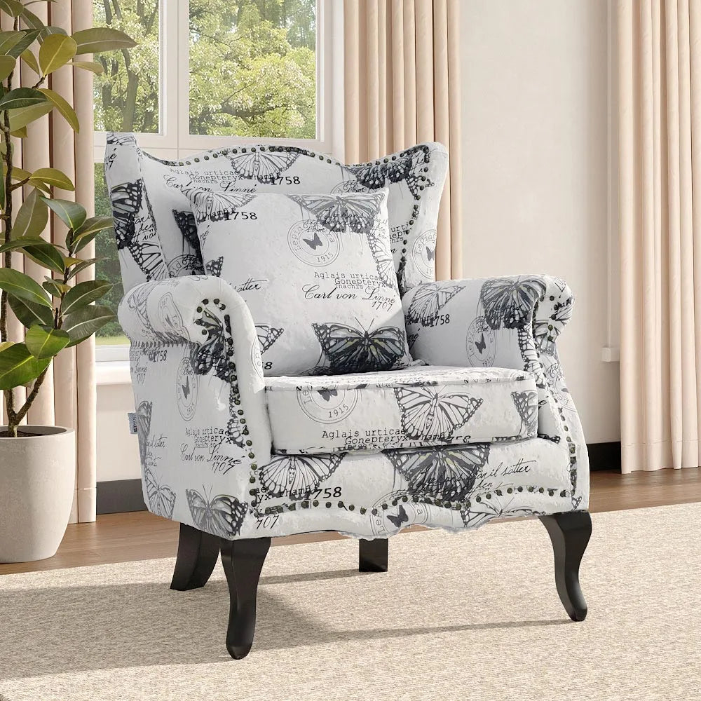 Introducing a retro-inspired butterfly wingback armchair that combines classic elegance with modern comfort. Upholstered in soft white velvet featuring a striking butterfly pattern, this chair adds a distinctive charm to your study, living room, or lounge. Its studded detailing and rolled arms enhance the vintage appeal, while the sturdy rubberwood legs ensure durability and stability. Designed with a generous seat depth and an included throw pillow, it offers exceptional comfort for extended relaxation. Crafted with a solid wood frame and high-density sponge filling, this armchair supports up to 150kg, making it both stylish and practical for everyday use. Assembly is required.