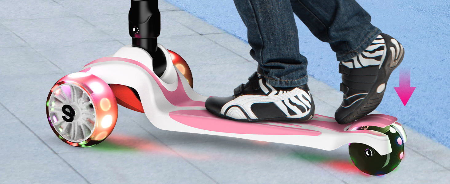 【LED Wheel Design】Super fun for your kids.The colorful LED wheels light up when in motion, providing enhanced visibility and making riding more enjoyable. This kick scooter promotes skill development and balance in children. The LED lights automatically light up while driving, without the need for a battery, and can continuously emit light