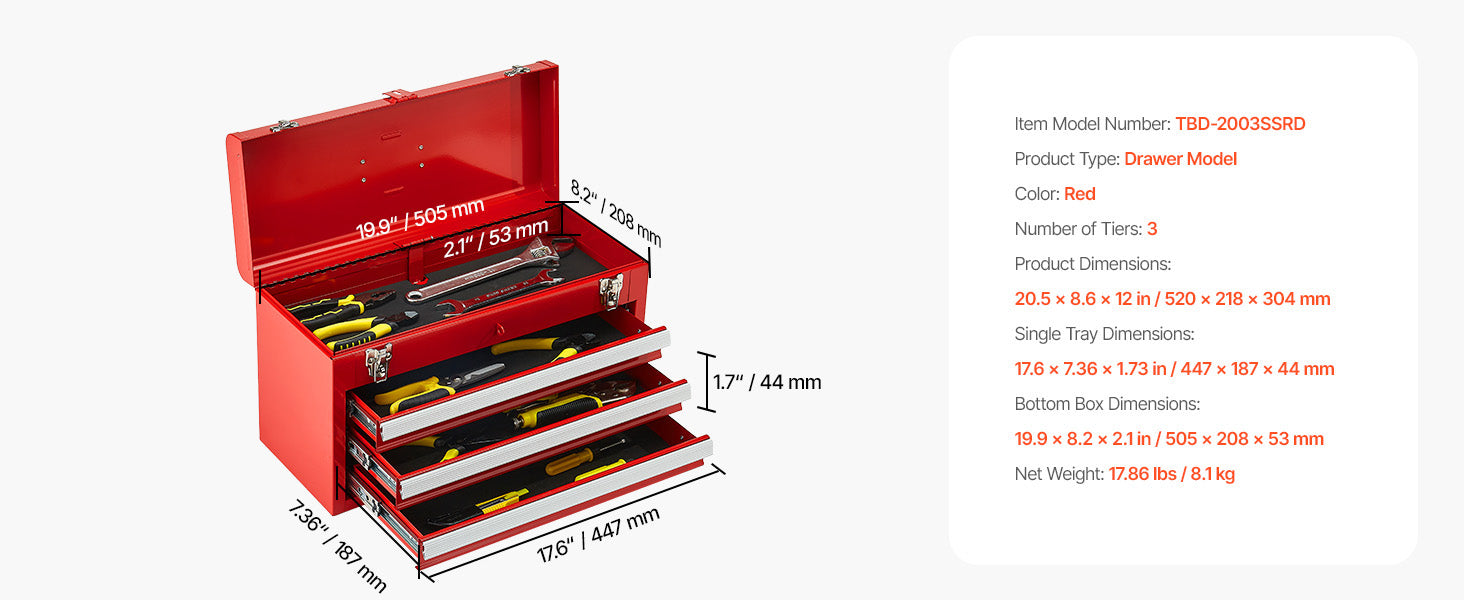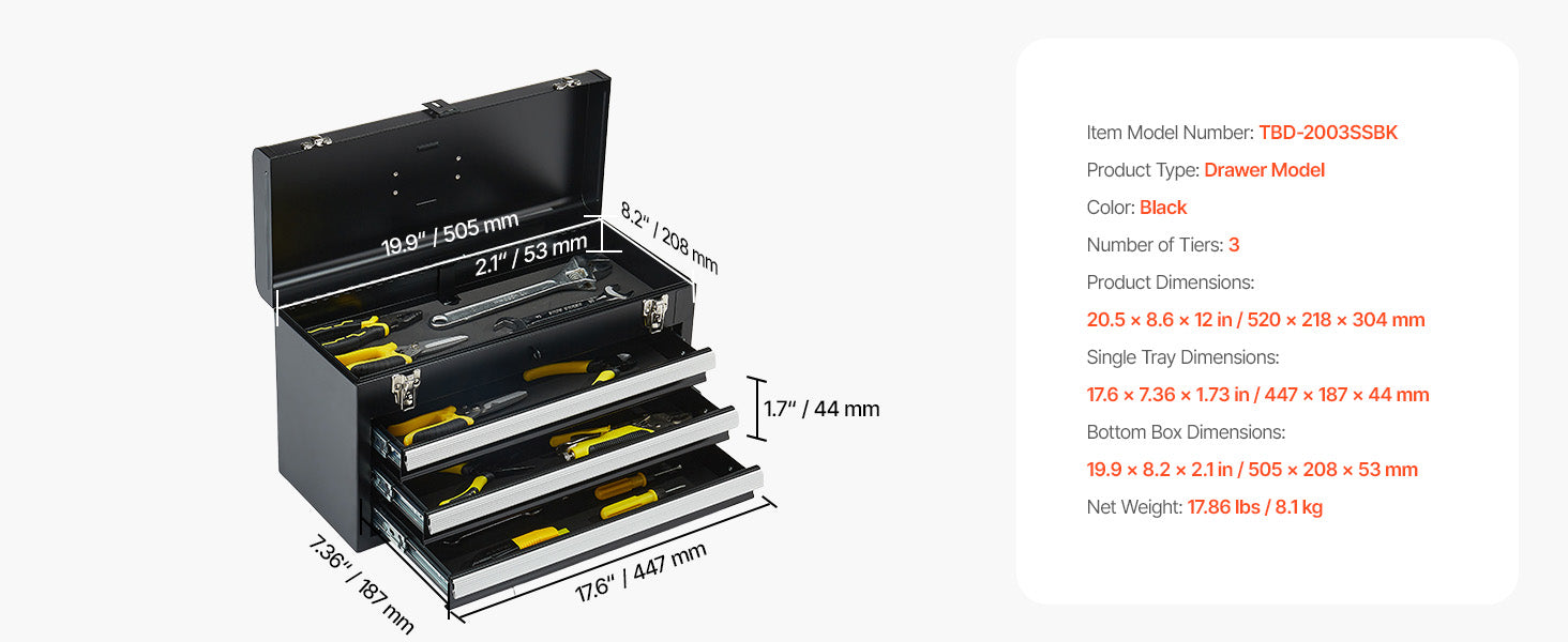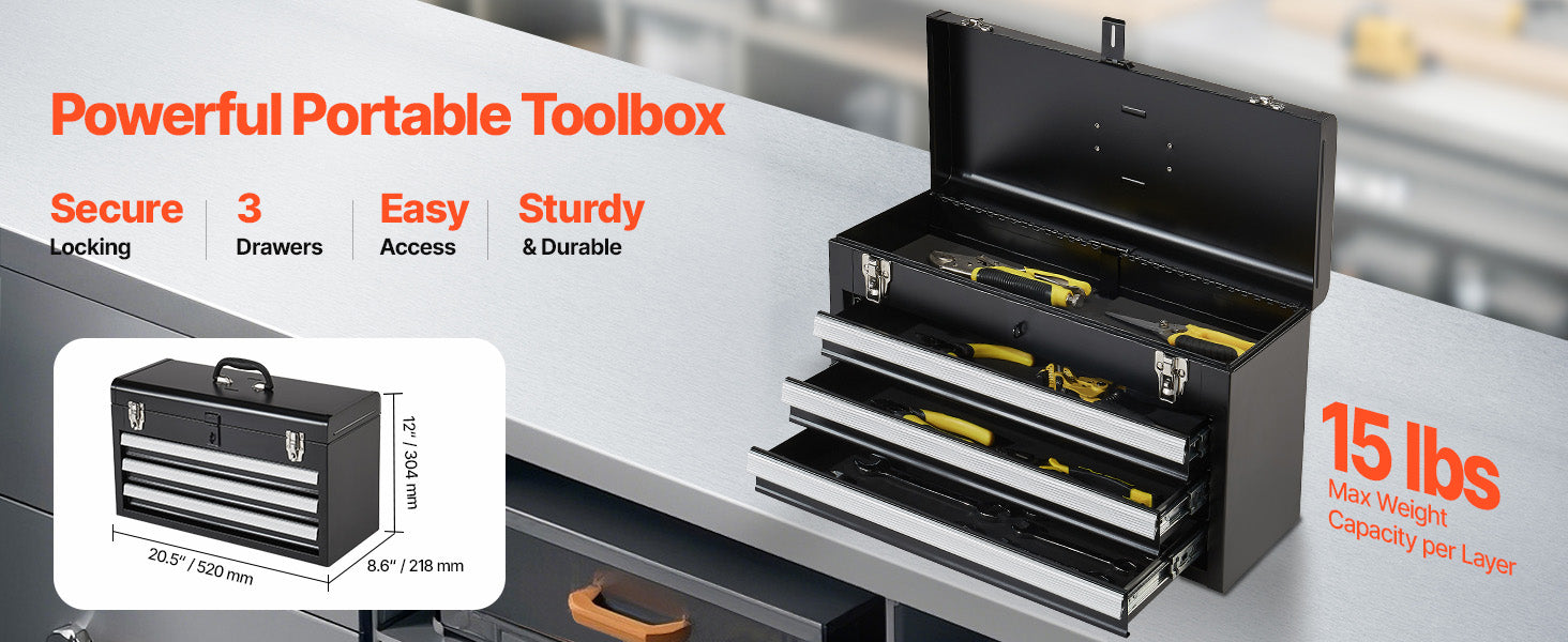Ample Storage Space:This tool box measures 20.5 x 8.6 x 12 inches and weighs 17.86 lbs. It has 1 top box (19.9 x 8.2 x 2.1 inches) and 3 drawers (17.6 x 7.36 x 1.73 inches), with each layer capable of supporting up to 15 lbs, offering abundant storage.