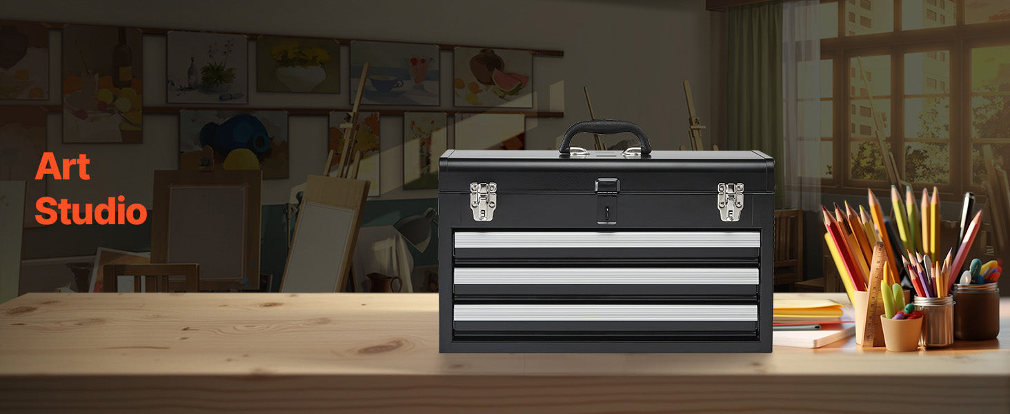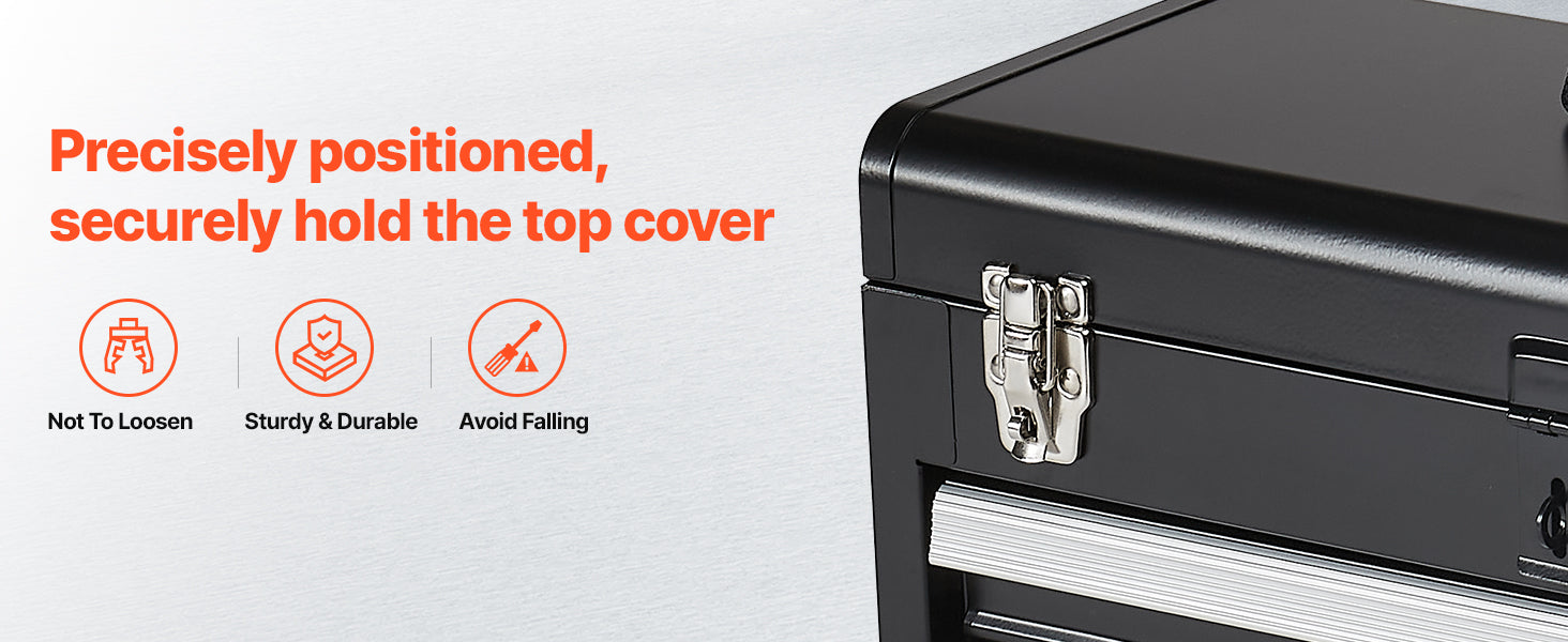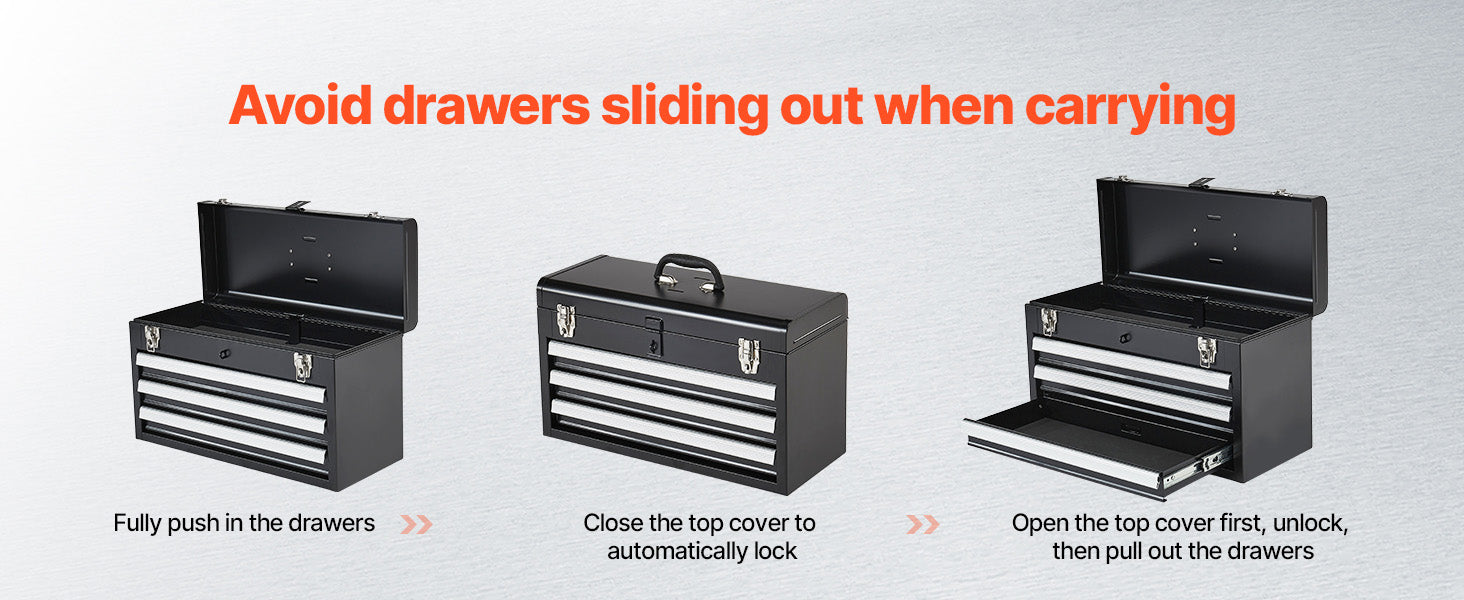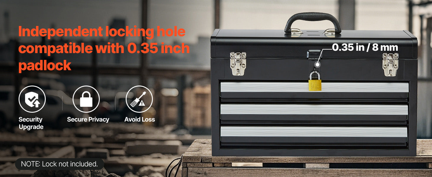 Auto-locking for Enhanced Security:The steel tool box features an auto-locking system. Push the drawers in and close the top lid to lock. The heavy-duty metal latch secures the top, and an additional lock hole allows for added security to protect your valuable items.