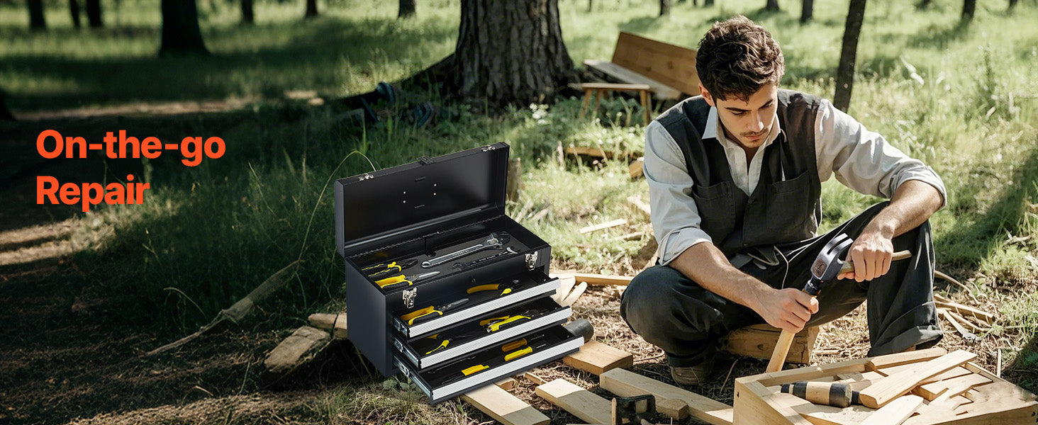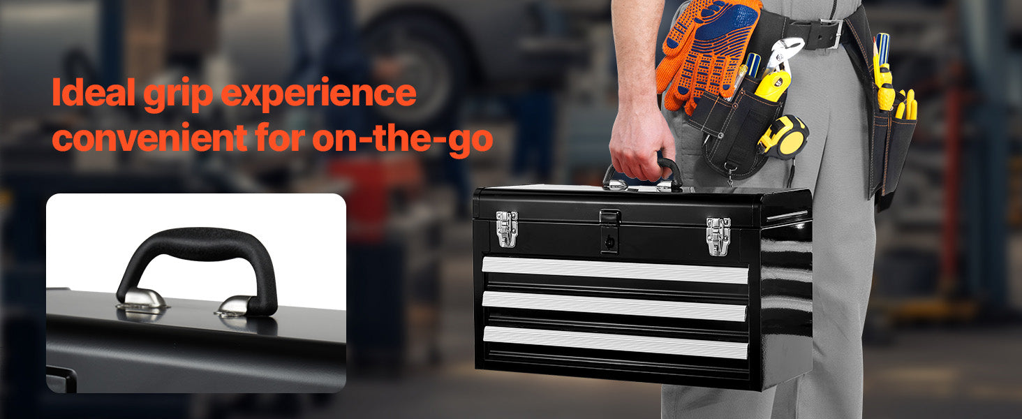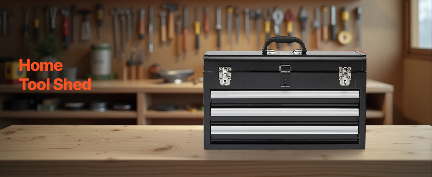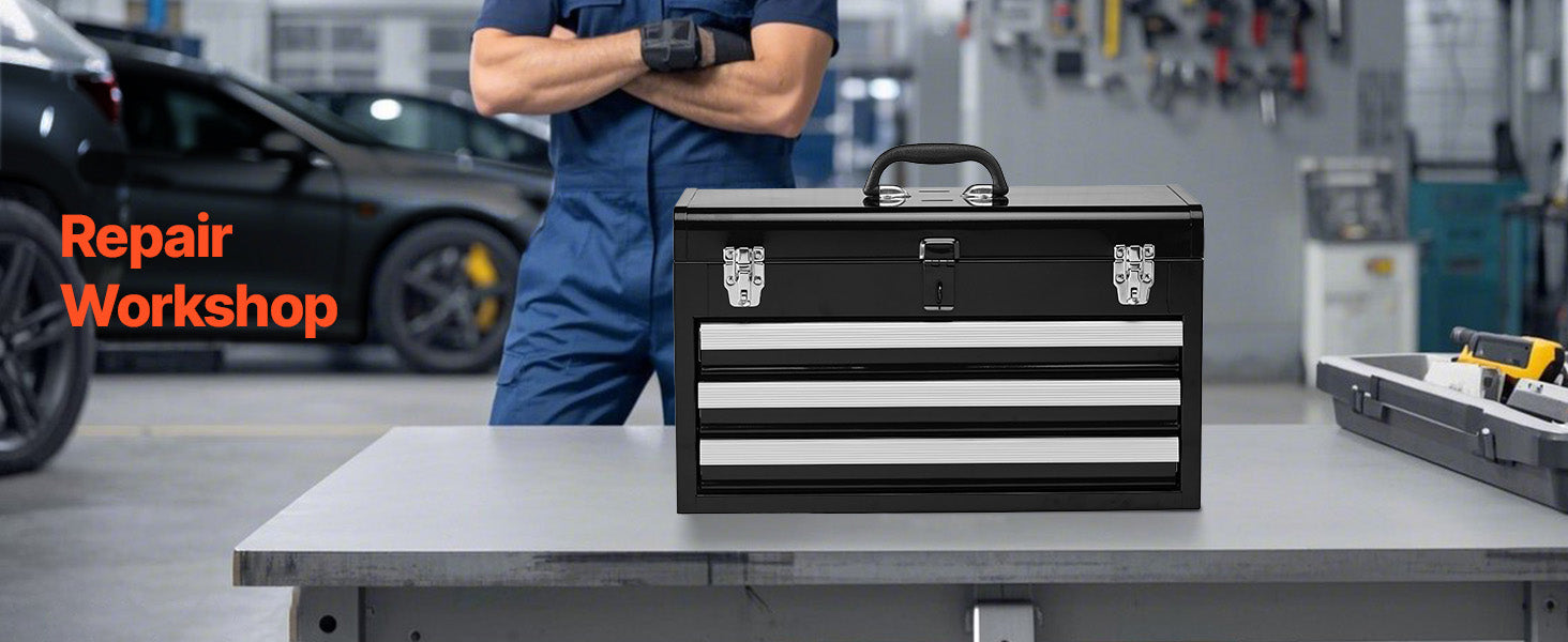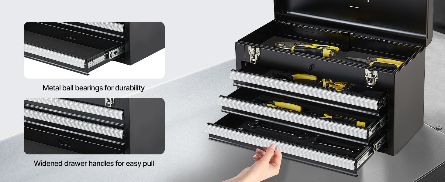 Auto-locking for Enhanced Security:The steel tool box features an auto-locking system. Push the drawers in and close the top lid to lock. The heavy-duty metal latch secures the top, and an additional lock hole allows for added security to protect your valuable items.