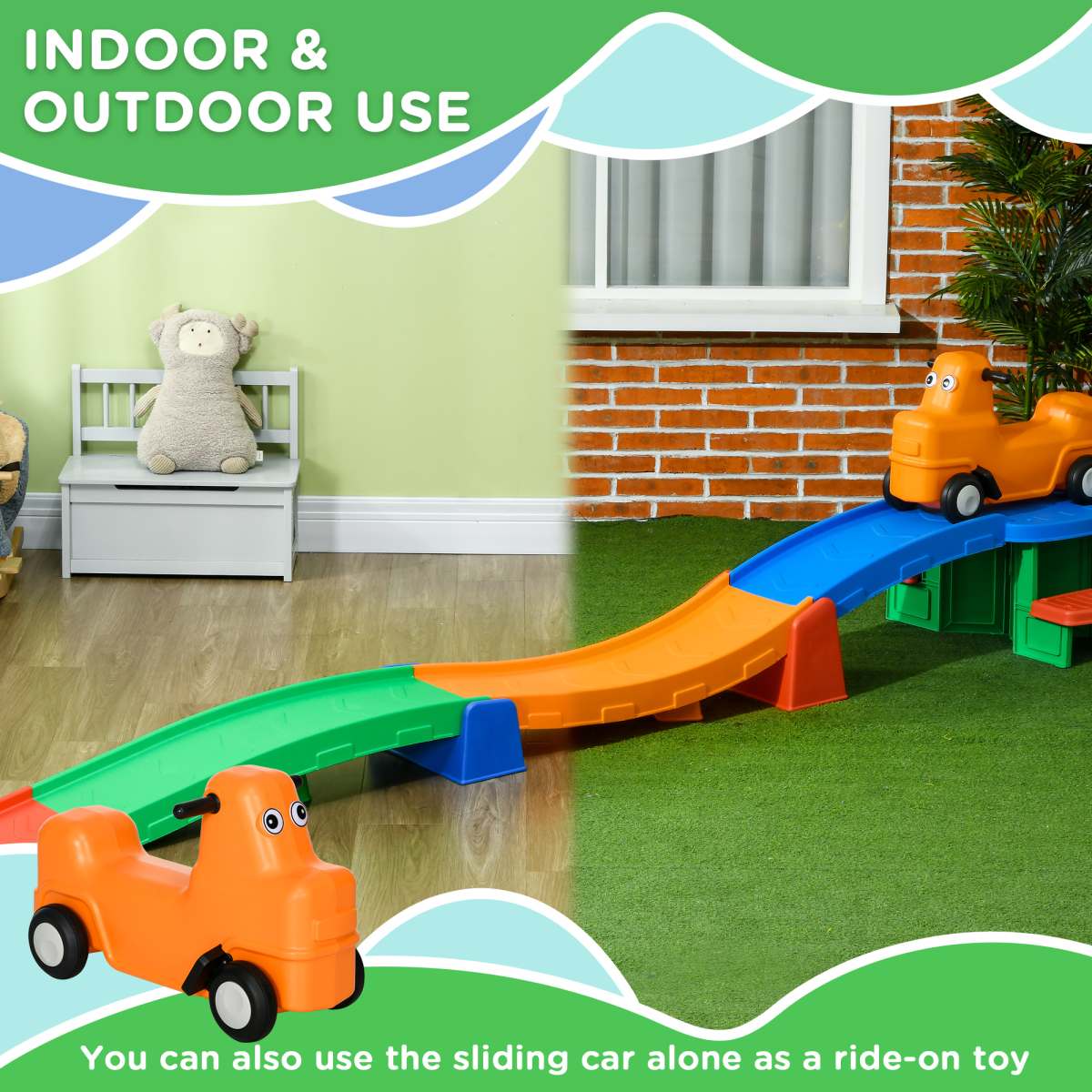 Introduce safe, active play with this compact rollercoaster ride-on. Crafted from durable PP and PE plastics, it features non-slip steps for secure climbing, a sturdy track for a gentle up-and-down ride, and a roomy sliding car for comfortable play. Designed for children aged 2 to 5 years, and certified to EN71 safety standards for added peace of mind.